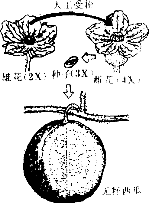 释义 | 无籽西瓜 无籽西瓜wuzixigua以同源四倍体西瓜(4x=44)作母本,二倍体西瓜(2x=22)作父本,杂交产生的同源三倍体(3x=33)西瓜(图603)。首先,在实践上 一般用结无条纹果实的二倍体西瓜种子或幼苗用秋水仙素溶液处理,使染色体加倍而创造出同源四倍体(由1个二倍体物种经染色体加倍得到的四倍体)西瓜,然后用这个四倍体作母本,用结具条纹果实的四倍体西瓜作父本,开花时人工授粉,让它们杂交,受精后得到的是同源三倍体种子。将三倍体种子种下,长成的植株再用正常的二倍体植株授粉,以刺激三倍体果实的发育(因三倍体花粉发育不良,不能刺激果实的良好发育),长出的西瓜(带有条纹的)就是无籽西瓜;没有条纹的就是四倍体之间偶然授粉产生的四倍体种子发育后的四倍体西瓜。因为有条纹对无条纹呈显性。无籽西瓜为什么几乎无籽?首先要弄清的是,1个配子要有生育能力或具有可育性,其染色体数要为基本染色体组的整数倍(参见“染色体组”条),否则是不可育的。无籽西瓜体细胞内有3个基本染色体组,即每种同源染色体有3条。减数分裂时,每3条同源染色体,其中两条分别分向两极(如图604中的A和B);而另 一条,可移向A极,也可移向B极,但无规律可循。可以想象,在每极得到11条染色体(1个基本染色体组)后,剩下的那11条染色体就要随机分到两极。这样,1个配子很难只得到1个基本染色体组,也很难得到两个基本染色体组,绝大多数配子的染色体数是多于11条但少于22条。因此,绝大多数配子不育,极少数配子可育(从理论上可算出)。这些极少数可育的雌雄配子结合在 一起才能结种子,当然,这个机会就更小了。这就是同源三倍体西瓜几乎无籽的原因。三倍体西瓜既然无籽,每年要种植无籽西瓜,就要每年把配好的四倍体和二倍体自交,以留种;每年把配好的四倍体和二倍体杂交,以提供生产无籽西瓜用种。自交留种和杂交制种虽较麻烦,但由于无籽西瓜几乎无籽、含糖量高、抗病力强、产量也高 图603 无籽西瓜的产生 图604 无籽西瓜减数分裂的同源染色体行为 ☚ 单倍体育种 小黑麦 ☛ |