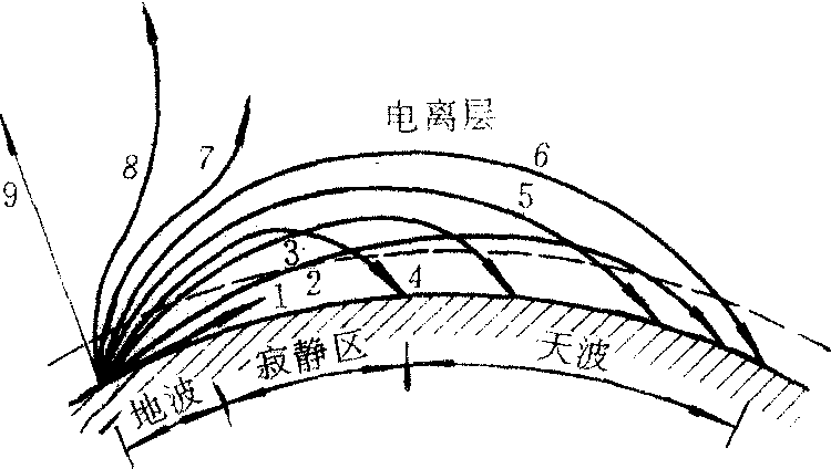 释义 | 无线电波的传播 无线电波的传播wuxian dianbo de chuanbo由天线发射或自然源辐射的无线电波,通过介质或受介质分界面的影响而到达天线的过程。无线电波在介质或介质分界面的影响下,有被折射、反射、散射、绕射和吸收等现象。沿地球表面传播的无线电波通常称为地波。在讨论地波传播时,电离层的影响不予考虑,主要考虑地球表面对电波传播的影响。半导电性球表面使地波的垂直方向电场强度远大于水平方向的电场强度。由于地波在地面上产生感应电流,使地波有较大衰减;在视线距离以外,地波传播是围绕弧形地球表面的绕射传播,且随它的频率、距离和地面的电参数不同而发生衰减。一般说来,在同样的距离上,波长愈长、场强的衰减越小,反过来说短波随距离的衰减较长波为快。实际的地面并不具有相同的电参数,当从陆地到海面传播时,地面性质突变,使电波的主要传播方向发生偏折,在起伏不平的地面上会发生散射,使能量转移,波长愈短散射愈严重。当传播距离增大时,电波由发射天线斜向投射到电离层,所产生的反射波(天波)会在接收点与沿地面传播的地波相干涉而引起信号强度的起伏变化。按地面波传播的规律,在远距离通讯时,波长越长越有利。但利用电离层可以用较短的波长以较多的信息容量和较小的功率来实现远距离通讯。这样,单纯地利用地表面波进行通讯的范围就受到了限制。不过,地表面波信号比较稳定,在长波和中波的广播、导航,以及短波乃至超短波的近距离通讯中仍广泛使用地面波。无线电波经电离层反射再回到地面的传播方式通常称为天波。低频波、中波和短波都可利用天波的传播方式。低频(30~300千赫的无线电波)天波在授时、导航、通讯、广播等有广泛用途。全世界已建有十几个罗兰—C导航台链。有些导航台兼作授时台使用。中国在陕西蒲城建有低频授时台。中波(频率在300千赫~3兆赫)主要用于广播、导航和通讯方面,它兼有长波和短波传播的特点,既可以沿地面绕射传播,也可通过电离层反射传播。短波(频率在3~30兆赫)可以沿地面以地波方式传播,而更主要是它远距离的以电离层反射的天波传播方式。一次反射(一跳)可传输4000千米,多次反射甚至可作环球传播。天波传播受电离层特性的影响。当无方向性天线辐射的电波的频率大于电离层临界频率时,其能量会沿不同的传播路径向远处传播,即不同的波束有不同的电波射线轨迹。如图示,电波波束1沿地面传播,因绕射作用而能达到离发射点几十至几百千米的地区,即地波。其他仰角的电波波均进入电离层。垂直入射电离层的波束9,因频率大于临界频率而穿透电离层不折回地面。略微倾斜的波束8、7经电离层折射后也穿过电离层。波束6的仰角较小,在电离层滑行后可能达到很远的地面。波束5的仰角更小,可以折回地面,但距离较近。波束4到达一最近距离,这个距离称为跳距。当仰角再小时,电波的到达距离反而更远了。当仰角接近地面切线方向时,电波可达4000千米左右的地方。跳距附近,电波能量比较集中,这种现象称为跳距聚焦。在大于跳距的距离上,均可能有两个仰角的波束同时到达,仰角大的称高波,仰角小的称低波。波束4中高波和低波重合。由图可见,存在一个天波和地波均不能到达的区域,称为寂静区。当电离层不断变化时,一定频率的电波传播距离、跳距和寂静区都会发生相应的变化。 ☚ 电磁辐射 地波 ☛ |