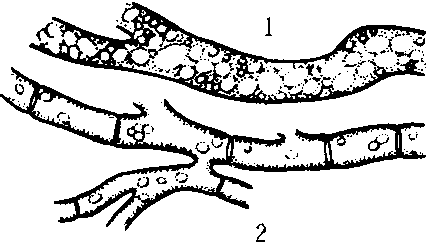 1.无隔菌丝 2. 有隔菌丝