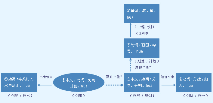 划分;划拨。常作带宾、带补谓语。 ~地界|~界限|把机械厂节余的钢材~一部分给农具厂|他~不清单句同复句的界限|~出各人的职权范围来|我已经把这笔款子~到你们的账号上了。 【近】 拨 分 【词语】 划拨 划策 划分 划清 划时代 划一 划一不二 【注意】 另见huá。