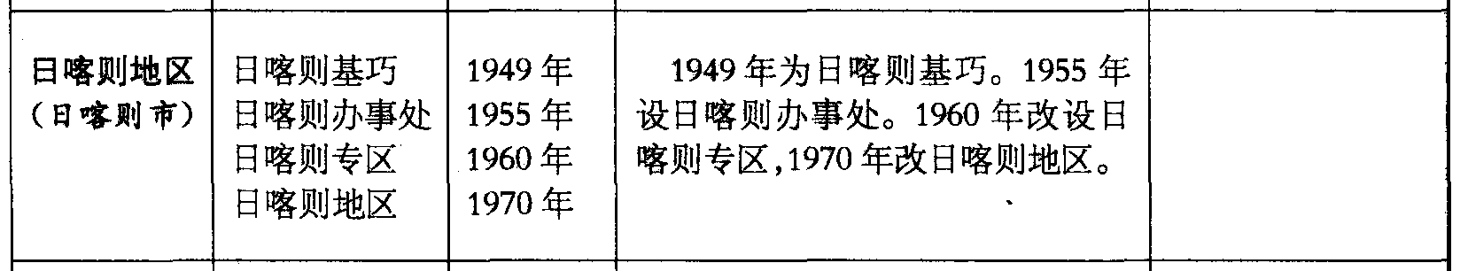 日喀则地区(日喀则市)日喀则基巧日喀则办事处日喀则专区日喀则地区1949年1955年1960年1970年1949年为日喀则基巧。1955年设日喀则办事处。1960年改设日喀则专区,1970年改日喀则地区。