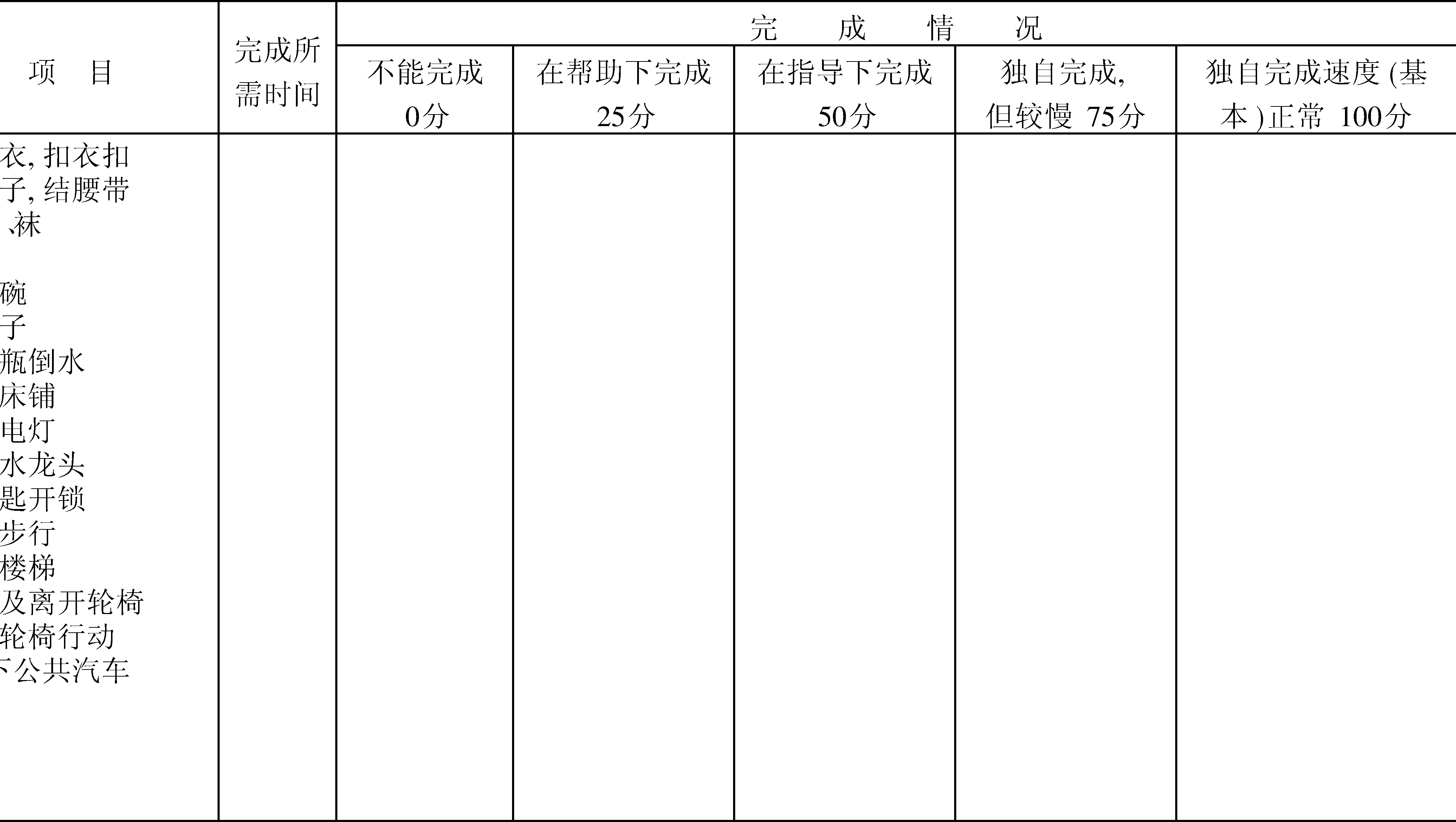 在检查和评定日常生活活动时,其完成的能力可分为5级:1级:不能完成,全靠别人代劳。2级:自己能做一部分,但要在别人具体帮助下,才能完成。3级:在别人从旁指导下,可以完成。4级:能独立完成,但较慢或需使用辅助器和支具。5级:正常,能独立完成。为更准确地定量,可采用下列的评分表。2000分为正常;1500分为轻微障碍;1000分为轻度障碍;500分为中度障碍;0分为重度障碍。病人日常生活活动(activities of daily living,ADL) 包括衣、食、住、行、个人卫生所必需的基本动作和技巧。