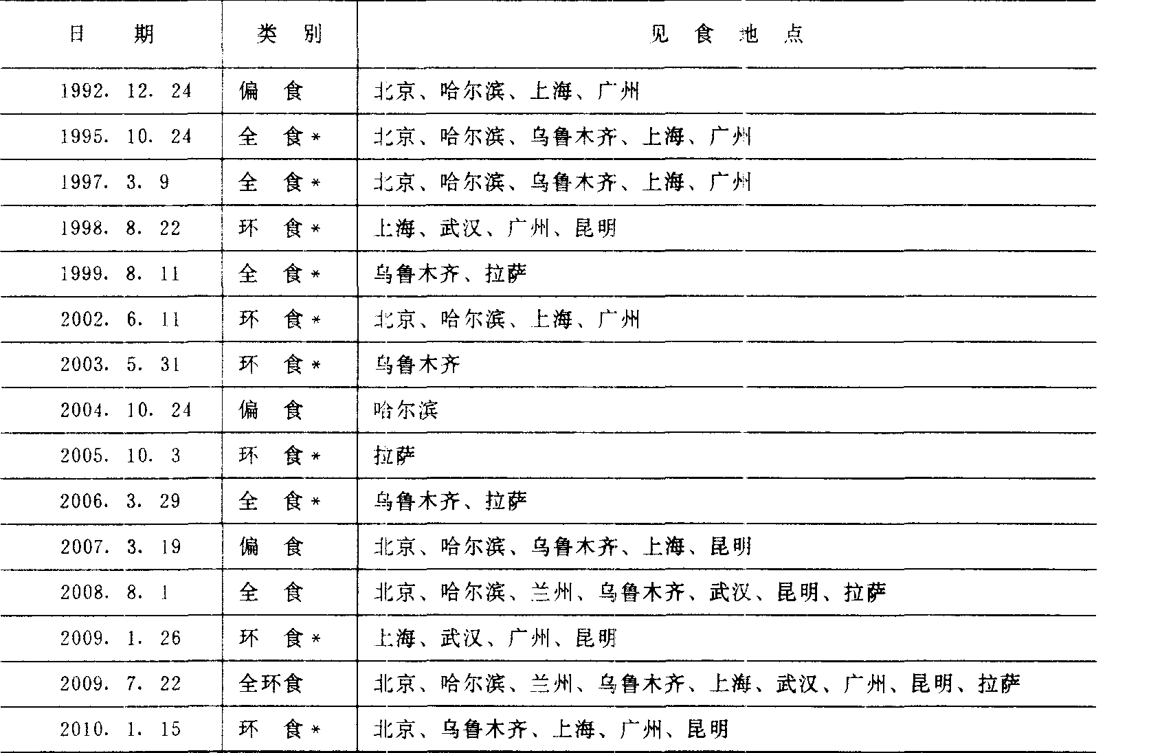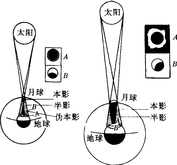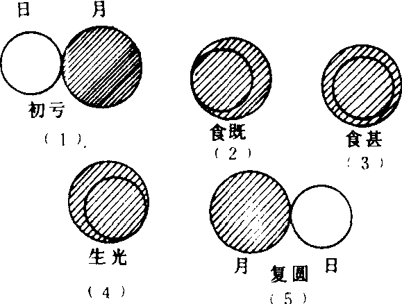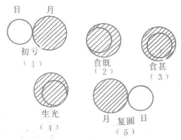 释义 | 日食 惟时羲和,颠复厥德,沈乱于酒,畔宫离次,俶扰天纪,遐弃厥司。乃季秋月朔,辰弗集于房①,瞽奏鼓,啬夫驰,庶人走。羲和尸厥官,网闻知,昏迷于天象,以干先王之诛②。 《尚书·夏书·胤征》 [注]①辰弗集于房:指阴阳相侵发生日食。②据现代天文学家陈遵妫统计,据有史记载迄止到辛亥革命前夕,我国古代日食纪事共有一千零四十二次。经他与《日月食典》相核对,基本上是符合的。这说明我国史志的记载是可靠的。另,因纪事太多,本书篇幅有限,仅选摘一些有特色的纪事,以飨读者。 【评】这条所载日食,梁代虞刊考证是在夏代仲康元年发生的。但由于夏代的历史还带有很大的传说性,仲康元年是什么年代尚难断定。加之有人认为《书·胤征》又是较晚的文献,所以这个结论还有争议。但据近代天文考古学家朱文鑫认为,这次日食是得到公认的,是世界上最古的记录。 不尽如钩,在亢二度,哺①时食从西北,日下哺时复。 《汉书·五行志》 [注]①哺:始于周代的时刻称谓,为今时十五至十七时。 【评】这是发生在汉征和四年八月辛酉晦(公元前八十九年九月二十九日)时的日偏食纪事。此纪事完整,说明了发生食时间、方位,过程及食时太阳在亢宿二度,其食分很大,离全食只差一个钩形。 日将蚀,诸方赤。 唐·段成式《酉阳杂俎》 【评】在日全食发生时,有日光为日食区域以外大气反射所成的淡红色光辉现象。古人在观测时,注意到了这一现象,并记载了下来。 日食lítsít日常饮食:~食好,恰赢食补lítsít ziáh hǒ,kāh ynáziáhboǒ(日常饮食好胜过吃补品)。《战国策·赵策四》:“日食飲得無衰乎?”宋·欧阳修《送唐生》诗:“日食不自飽,讀書依主人。” ![]() ![]() 日食rìshí月球运行到地球和太阳的中间,太阳光被遮住的现象。 日食(反)月食 古代名物 > 天象類 > 天體部 > 其他 > 日食 日食 rìshí 亦作“日蝕”,亦稱“日虧”。月球運行至地球和太陽之間,太陽部分或全部被月球所遮没之天象。有全食、偏食和環食三種,皆發生於農曆初一。古人或以爲是不祥之兆。《左傳·昭公七年》:“四月甲辰朔,日有食之。晉侯問於士文伯曰:‘誰將當日食?’”《史記·天官書論》:“蓋略以春秋二百四十二年之間,日蝕三十六。”《漢書·鮑宣傳》:“今日蝕於三始,誠可畏懼。小民正月朔日尚恐毁敗器物,何况於日虧乎? ” 月食←→日食yuè shí ← → rì shí月食:地球运行到太阳和月亮中间时,太阳光被地球挡住,不能射到月亮上去,因此月亮上就出现黑影,这叫月食。 日常生活 日常生活兴居 居处 起卧 动止 日食 闲 ☚ 生活 维生 ☛ 日月亏缺的现象 日月亏缺的现象食(食相;偏~;全~) ☚ 自然现象 怪异现象 ☛ 日食月球挡住了太阳。由于月球绕地球运动轨道(称为白道)与地球绕太阳运动轨道(称为黄道)不在同一个平面里(有5°多的交角),所以不是每个月的农历初一(朔)和十五(望)都发生日食。但是,每年至少发生日食2次,最多可有5次。就全世界范围来说,平均每100年发生日食236.7次,其中:日偏食82.5次,日全食67.2次,日环食82.2次,日全环食4.8次。具体到某一地点,平均每3年可以看到1次日食,300多年才能看到1次日全食。日食有周期性,古巴比伦人发现18年零11天的周期(约合223个朔望月,称为沙罗周期),中国汉代人发现了135个朔望月的周期。《春秋》一书记载的37次日食,绝大多数已被证实。 日食 日食rishi耀眼发光的日面在短时间内部分或全部被遮住,这就是日食。日食发生的原因是在新月时(朔),地球、月球、太阳位置接近同一直线,月球影子扫过地球表面,以致地球上的观察者部分或全部看不到日面。当观察者位于月球的本影区,看到日面部分被食,叫日偏食; 观察者位于月球的本影区,看到日面全部被食,叫日全食;观察者位于伪本影区,看到日面周围呈一环状而日面中心被遮叫日环食(图1)。月球有绕地球的公转,地球有自转,共同运动的结果,月影是自西向东扫过地面,从地球上看去,月球首先从日面西边遮挡。日全食可以分为五个阶段(图2): 图1 日食的产生 (a)日全食(b)日环食 图2 日全食的五个阶段 月球不大而离地球距离有远近变化,所以月球本影扫到地球上只有200公里左右宽,有时才几十公里宽,能看到日全食的地区面积很小,即便看到也只有20秒~7分钟的时间。而通过观察日全食可以得到日冕等太阳高空大气的情况和其他平时难以得到的宝贵资料。特别对于业余爱好者,这种观测时机是不可多得的。根据计算,一年最少发生2次日食,最多发生7次日食和月食。但对某一地区来说,发生日食,特别是日全食就很罕见了,类似的交食要经过约18年零几天即6585.32日才重复一次,这个周期叫沙罗周期。下表列出1992年至2010年我国能见到的日食: 我国能见到的日食表(1992—2010) *我国只见偏食。 ☚ 月球 月食 ☛ 日食 日食rishi太阳被月球全部或部分遮掩的天文现象。月球在绕地球运行过程中,有时会走到太阳和地球中间,若月影掠过地球,在影子里的观测者就会看到太阳被月球遮住,这就是日食。图1示日食的形成。月球的影子可以分成本影、半影和伪本影三部分。由于月球绕地球的轨道和地球绕太阳的轨道都是椭圆,所以日、月和地球的距离时远时近。在日食时,地球上的观测者可能处于月影的本影区,可能处于半影区,也可能处于月影的伪本影区。处于本影区内的观测者看到日面完全被月球遮住,称为