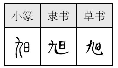 【提示】日中间的横,宋体与左右两边相接,楷体与左边相接,与右边相离。 *旭xù6画 日部 太阳初升的样子: ~日。 旭 ☚ 曠 晉 ☛ 旭xù小篆形声字。从日,九声。声母演变如斤欣、解懈、戒械例。韵变是上声转入声,汉藏语系中兄弟民族有读“九”为入声的。是太阳初出状,一般指早晨时;又是光明,阳光义。组词如:旭日。 旭★常◎常