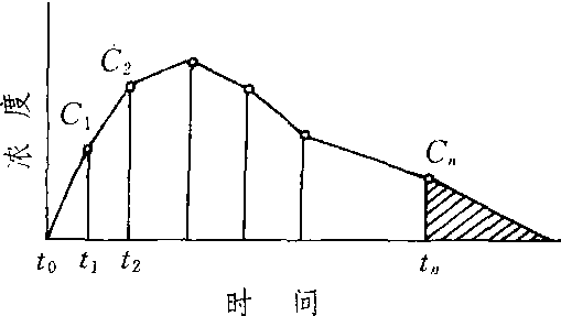 释义 | 时量曲线下面积area under timedose curve药物代谢动力学参数。血药浓度数据对时间作图所得曲线下面积。表示药物进入血循环后,从零时起至所有原形药物全部排尽为止的血浆内药物数量。用梯形法则计算。用于测定生物利用度等药动学参数。 梯形法则计算面积示意图 |