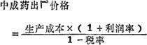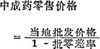 以一种或多种中药材为原料、经过蒸、炒、煅、烫、炙、浸等加工工艺而配制的丸、散、膏、丹、药酒、药露、片剂、冲剂、浓缩膏剂、注射剂和汽雾剂等药品的价格。 它分出厂价格、批发价格和零售价格。 中成药的出厂价格是在正常条件下,中等生产水平的平均成本加上利润和税金构成。它是制定中成药批发价格的基础,也是影响零售价格的重要因素。 其计算公式是:  中成药的批发价格分为产地批发价格和销地批发价格。 产地批发价格,即按出厂价格加上规定的进销差率制定的批发价格。销地批发价格,即按产地批发价格加上规定地区差率制定的批发价格。 按国家规定;药酒、糖浆的销地批发价格,是按产地批发价格加上产地至销地的合理运杂费来计算。其计算公式为: 中成药产地批发价格=出厂价格×(1+进销差率) 中成药销地批发价格= 药酒、糖浆的销地批发价格=产地批发价格+产地至销地合理运杂费用 中成药的零售价格是最终销售价格。 是按当时批发价格加上规定的批零差率计算的,其计算公式是: