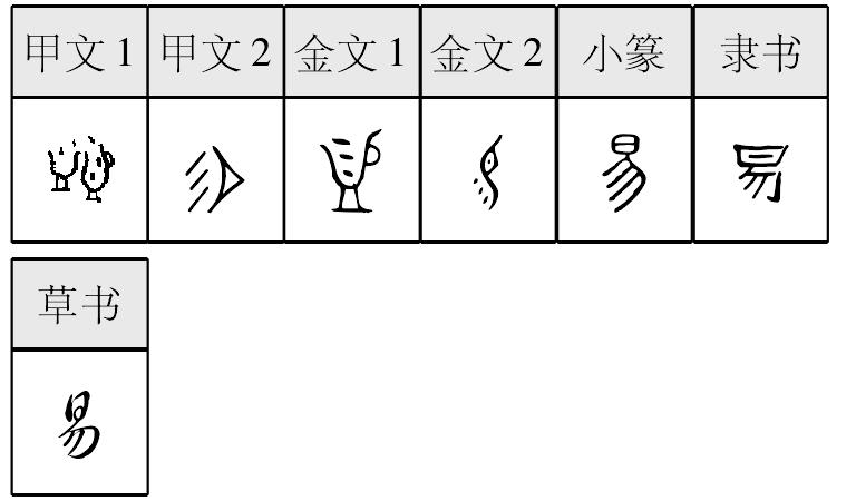 yì表意,甲骨文1象酒器中已满而向另一酒器内倾注之形,金文1简省为一个酒器,甲骨文2、金文2、小篆字形有讹变,隶定为“易”。本义表示满而溢出(是“益”或“溢”的本字),引申为改变、交换等,假借为容易。 【辨析】 以“易”作音符构成的形声字一般韵母为i,但声调和声母不同。yì:蜴、埸∣xī:锡、裼∣tī:踢、剔∣tì:惕∣cì:赐。易 (yì)蜥易也。 【按】“易”之構意尚無確論。古文字形作 、 、 、 等,沿兩個方向演變。徐中舒、饒宗頤以爲“賜”或“錫”之初文;孟蓬生以爲象雙手持器向另一器傾注液體之形,本義爲傾注。 易 ☚ 相 馬 ☛