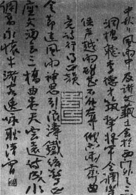 【简介】: 现代·刘孟伉书。纸本,行书,五言律诗一首并记。凡七行,共九十字。刊于《中国书法》一九八七年第一期。 【赏析】: 刘孟伉把篆书,尤其是汉碑的用笔融入行草,出以中锋、点画刚健雄浑,意气酣足,如铁铸玉成,提顿起收峻拨果断,多用折锋方笔而笔势拗峭;时或掺用草隷的奋笔波磔。这些都暗示了一种刚毅倔强的性格。他吸收颜体正书中笔画横轻竪重的特点,在行草结中强调粗细轻重的对比变化,增强了线结构的立体空间感和跳宕的节奏感。他写字前慢,挥运时快。首先,他十分讲究磨墨,曾有《歙产小方研铭》云:“不难作字,而难磨墨,平矜释躁,指定腕和,左右回旋、前后开阖,诚能乎此,又何暇求笔势之妙诀也哉”。磨墨旣成,向纸良久,缓捻笔管而结思已成,即行挥毫,顷刻而就。挥运之时,笔随情走,其奋疾如怒猊渴骥,骤雨急风,常常使侍书者牵纸不及。这种奋疾旣包含了沉强的力量,达到了疾与涩的高度统一,又是使他的笔势纵横排宕,生发奇姿异态的契机。因而,他的行草线条情采,淋漓痛快,却又不飘不堕,流中有留,意味沉厚,显示出他心忘乎手,极其精熟灵活地操纵毛笔的本领。
