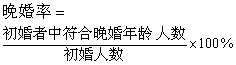是计划生育指标之一。指初婚男(女)青年中符合晚婚要求者所占的百分比。即: