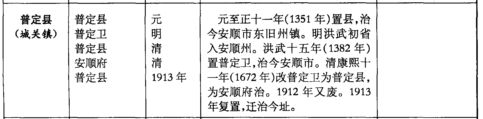 普定县(城关镇)普定县普定卫普定县安顺府普定县元明清清1913年元至正十一年(1351年)置县,治今安顺市东旧州镇。明洪武初省入安顺州。洪武十五年(1382年)置普定卫,治今安顺市。清康熙十一年(1672年)改普定卫为普定县,为安顺府治。1912年又废。1913年复置,迁治今址。
