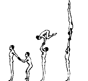 指用普通握,“上面人”跳起成“下面人”手上手倒立的动作。上手方法的一种。“上”在前同向站立,“下”屈膝半蹲与“上”普通握,“上”支撑“下”双手蹬地跳起,经团身上成手倒立,同时“下”向上托举起立。上倒立时,“上”肩稍前倾,经屈膝上举含胸提臀,迅速伸直身体并固定;“下”在托举时可向前移动一步,便于使重心落在脚的支撑面内,并通过手的屈伸或臂的移动调整重心。上倒立的过程中应无中间停顿。关键在于两人有节奏地协调配合。是常用的上手基本方法之一。