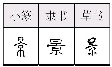 【提示】日,中间一横宋体与左右两边相接,楷体与左边相接,与右边相离。小,第二笔宋体是撇,楷体是撇点。 *景jǐng12画 日部 (1) 风光: ~色|风~|良辰美~|燕京八~。 (2) 情形;情况: ~象|~况|前~。 (3) 戏剧、影视表演时设置或选取的景物: 内~|外~。 (4) 仰慕;佩服: ~慕|~仰。 (5) 姓。 另见yǐng(480页)。