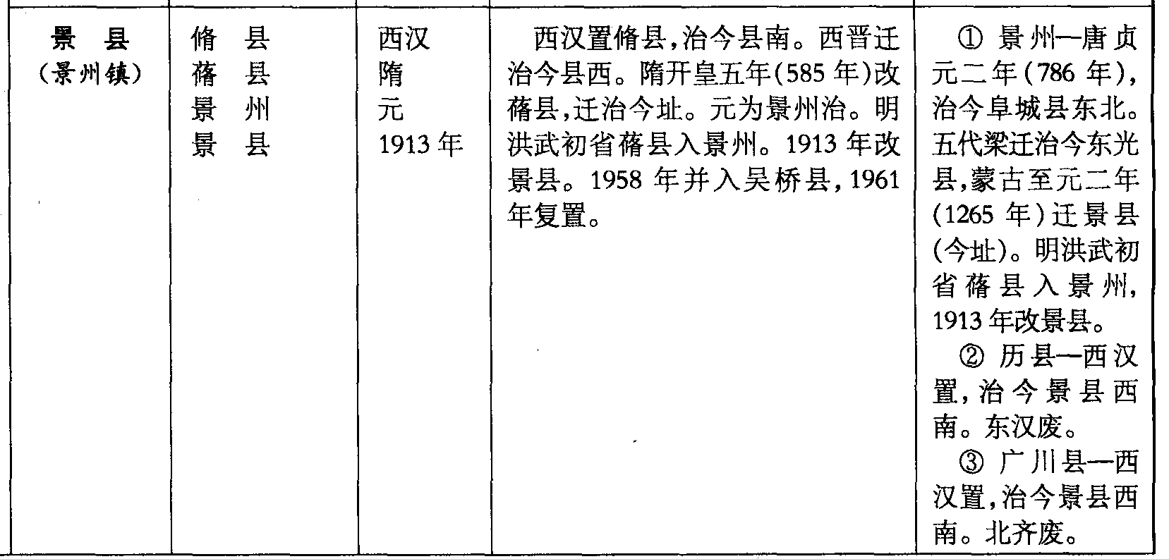 ❶ 景州—唐贞元二年(786年),治今阜城县东北。五代梁迁治今东光县,蒙古至元二年(1265年)迁景县(今址)。明洪武初省蓨县入景州,1913年改景县。