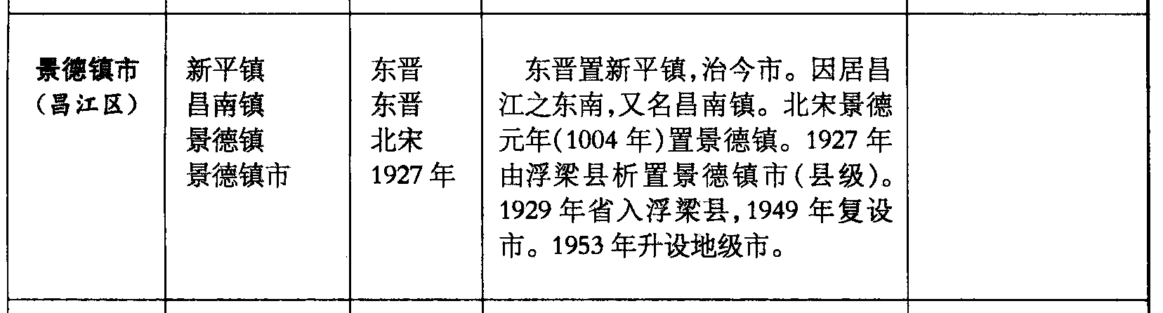 景德镇市(昌江区)新平镇昌南镇景德镇景德镇市东晋东晋北宋1927年东晋置新平镇,治今市。因居昌江之东南,又名昌南镇。北宋景德元年(1004年)置景德镇。1927年由浮梁县析置景德镇市(县级)。1929年省入浮梁县,1949年复设市。1953年升设地级市。