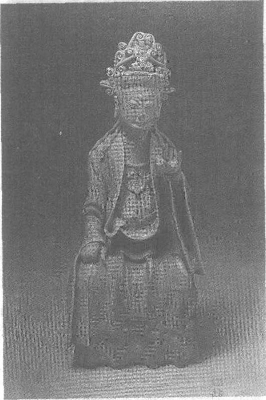 宋。高25.6厘米。上海博物馆藏。青白釉又名“隐青”、“影青”,釉色白中闪青。景德镇烧青白瓷的窑址,已发现的有湖田、胜梅亭、黄泥头等处。当时这些窑场的产品对东南地区的瓷窑影响极大,各窑纷纷仿效,宋元时期盛烧不衰,形成了青白窑系。此作品是宋代景德镇窑烧制。观音为坐式。头戴宝冠,胸佩璎珞;上身着宽袖衣,下穿花裙。衣褶线条自然流畅,绘红蓝彩,并以贴金装饰,惜色彩多已剥落。衣缘、璎珞宝珠等处施青釉,釉色莹润光亮,脸、胸等处涩胎无釉。观音一手扶膝,一手做手印,低眉垂目,恬静自如,似进入博静境界。底部墨书“大宋淳祐十一年辛亥”款,极为难得。