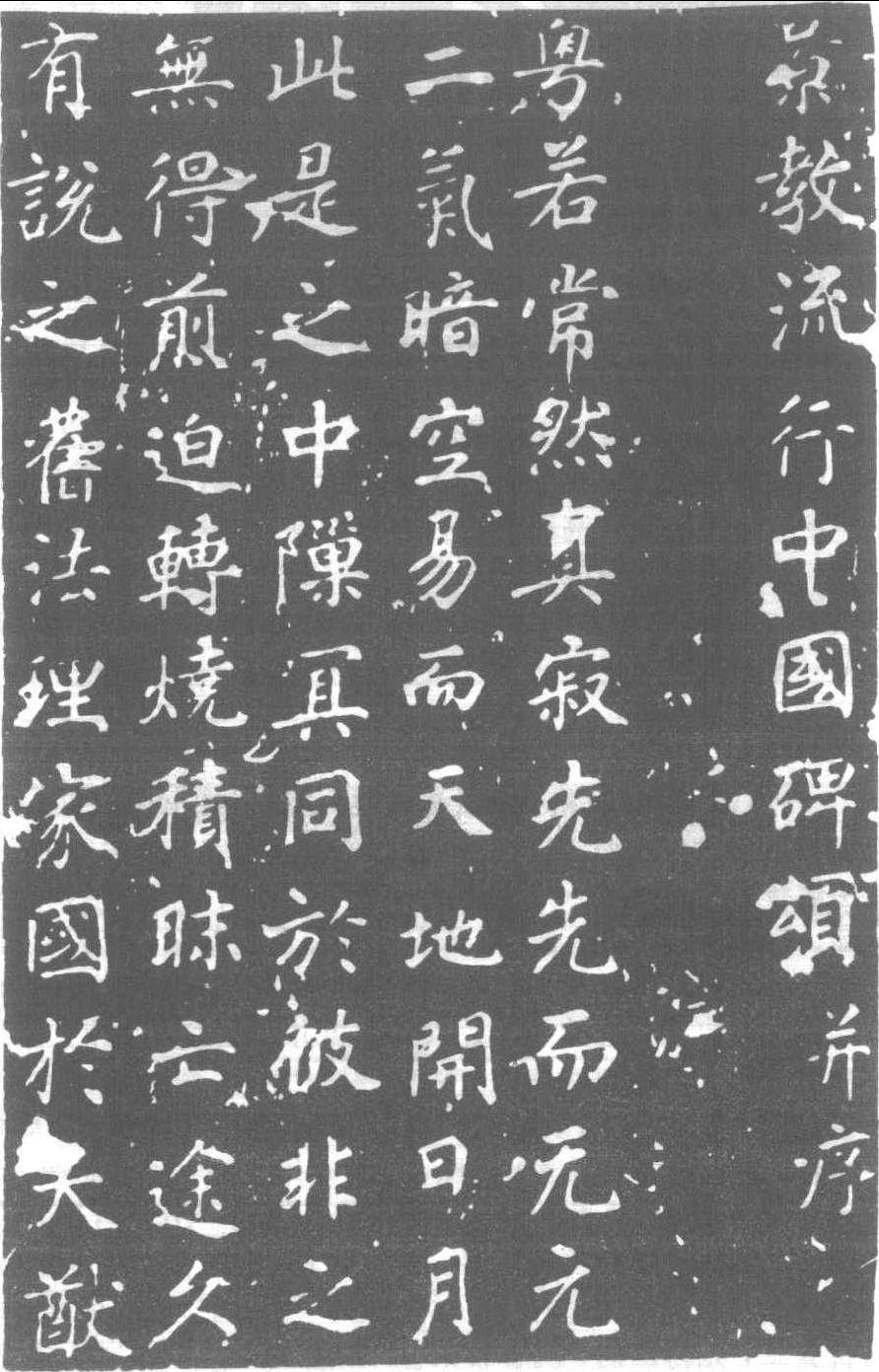 景教流行中國碑 (局部) 唐·建中二年(781)刻。釋景净撰,吕秀岩書。正書三十二行,行六十二字。碑下及兩傍皆刻有歐文。又名 〈大秦景教流行中國碑〉。碑久埋土中,明·崇禎年間 (1628—1644)出土於長安崇仁寺,完好不缺一字。高四尺七八寸,廣三尺五寸。書者吕秀岩雖書名不顯,書法則秀麗天然,屬唐碑之上乘。是碑不僅文字稱美,且記唐代景教由大秦國輸入,在中國流行之事,對研究中國宗教史有參考價值,故為世所重。今移置西安碑林。左傍鎸刻清韓泰華大字觀記,曰:“後一千七十九年,咸豐己未 (1859)武林韓泰華來觀,幸字畫完整,重造碑亭覆之。惜故友吴子苾 (式芬) 方伯 (三年前即世)未及同游,悵然久矣。”此記個别字刻於原碑字上,冒瀆碑石,甚可惡!而造亭護碑則可嘉,憶故友之心可貴矣。清葉德輝有《景教碑文紀事考正》,光緒二十七年(1901)刊行。此碑文在日本德川時代 (即江户時代1603—1867) 禁行。 |