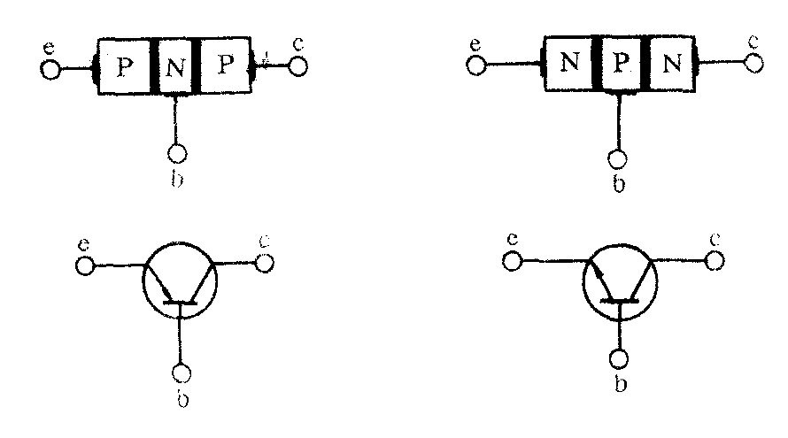 由两个PN结组成的具有放大性能的半导体器件。晶体三极管分PNP型和NPN型两种,锗管多为PNP型,硅管多为NPN型,图1分别为PNP、NPN三极管结构示意及其符号。不论那种晶体三极管,都有三个区,即发射区、基压和集电压。相应地从三个区引起的三个电极分别叫发射极e、基极b和集电极c。发射区与基区之间的PN结叫集电结。在制作时使发射区的多数载流子浓度大,基区的多数载流子浓度比发射区多数载流子浓度小很多,且基区做得很薄(1微米到几十微米)。如图2示,以NPN管为例说明晶体三极管的工作过程和放大作用。