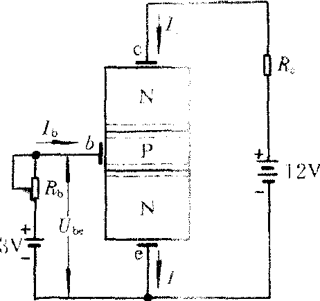 ❶发射结加正向电压,Ub>Ue,发射区(N型)多数载流子的电子,在这正向外加电场作用下,越过发射结进入基区,形成发射极电流Ie。(因为基区(P型)的多数载流子(空穴)浓度很小,这里略去它所形成的电流)。
