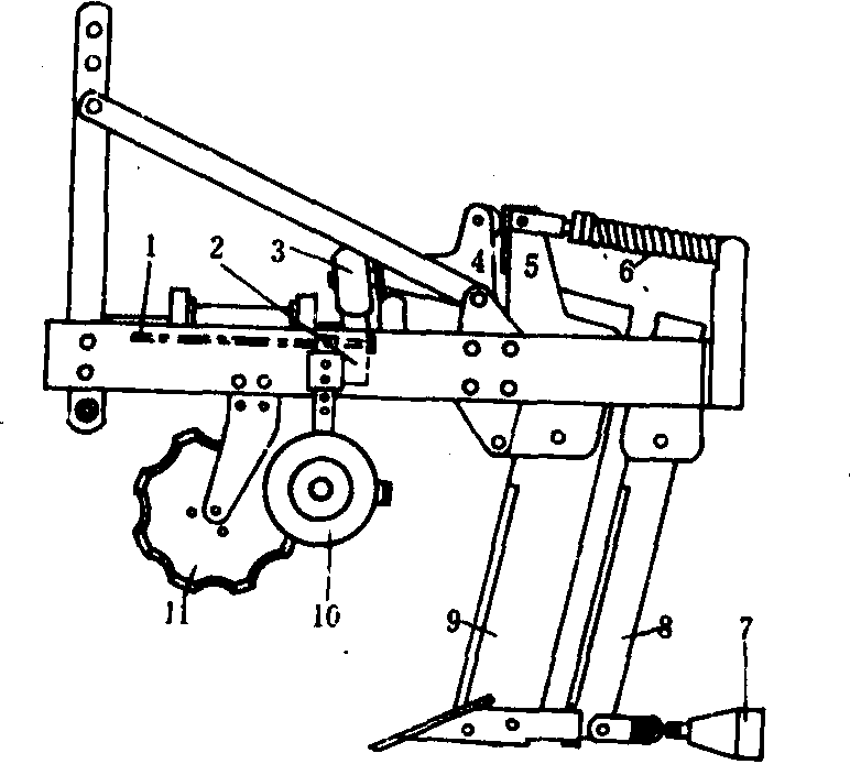 释义 | 暗沟犁earth mole在地下用塑孔器挤压土壤形成地下排水渠道(即暗沟)的机具,又称鼠道犁。 振动暗沟犁示意图 1. 输入轴;2. 振动凸轮;3. 从动滚轮;4. 振动架;5. 振动刀刃安装附件;6. 压缩弹簧;7. 塑孔器;8. 固定刀刃;9. 振动刀刃;10. 限深轮;11. 圆盘锯齿刀刃 非振动式暗沟犁 主要由机架、切土刀柱和塑孔器组成。作业时,切土刀柱开出窄缝,其下端带有炮弹状的塑孔器沉入土中,靠塑孔器挤压土壤形成暗渠。其截面多呈圆形,直径为80~100毫米,距地表的深度为30~80厘米。当地下水渗到暗渠时即可排除。暗渠排水不占耕地,排水效果较好。 主要工作部件 是塑孔器,有单面楔、双面楔(与切土刀柱固定联结)和圆锥头(与切土刀柱是挠性联结)三种型式。塑孔器为一个或两个前后相连的流线型圆柱体,刚性或柔性联结在切土刀柱的下部。塑孔器用高强度、高耐磨性钢材制造,由锥头、圆柱体、尾部组成。锥头的锥角对于泥炭土采用35°~50°;对于矿物质土壤采用40°~55°。圆柱体部分的直径为80~120毫米,其长度,泥炭土为直径的1.5倍,矿物质土壤为150~200毫米。尾部长度为20~50毫米;尾部锥角为20°~25°。切土刀柱对地面的后倾角,对于矿物质土壤,极限切削角为70°~85°,泥炭土的极限切削角为100°~130°。 暗沟犁mole plough |