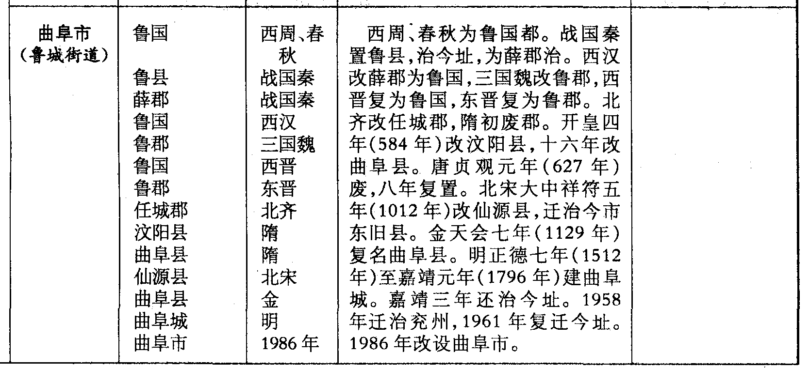 西周、春秋为鲁国都。战国秦置鲁县,治今址,为薛郡治。西汉改薛郡为鲁国,三国魏改鲁郡,西晋复为鲁国,东晋复为鲁郡。北齐改任城郡,隋初废郡。开皇四年(584年)改汶阳县,十六年改曲阜县。唐贞观元年(627年)废,八年复置。北宋大中祥符五年(1012年)改仙源县,迁治今市东旧县。金天会七年(1129年)复名曲阜县。明正德七年(1512年)至嘉靖元年(1796年)建曲阜城。嘉靖三年还治今址。1958年迁治兖州,1961年复迁今址。1986年改设曲阜市。