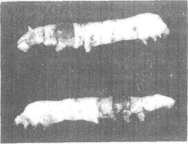 释义 | 曲霉病aspergillus disease常见的真菌寄生性蚕病之一,由曲霉菌寄生引起,主要为害小蚕。病蚕尸体大都干瘪,局部长出白色绒毛状的气生菌丝,并产生深绿色或褐色的分生孢子群。病蚕尸体由于细菌腐生,比其他硬化病蚕容易腐烂。 图1 曲霉菌孢子 图2 曲霉菌生长形态 传染 主要是病菌的分生孢子,通过空气、蚕具、蔟草等介体,经皮接触传染引起发病。病菌具有几丁酶、解朊酶、解脂酶、淀粉酶等多种酶类。发芽管依赖化学的、物理的作用,穿入蚕的体壁,在真皮细胞层,皮下脂肪体、肌肉层寄生发育。分生孢子附着于蚕体。发芽侵入体壁的经过时间为12~18小时。病菌的营养菌丝不产生短菌丝,仅局限在侵染部及其附近的组织中发育,已知黄曲霉群中的有些菌系能产生多种毒素,常称黄曲霉毒素,其中黄曲霉毒素B1毒性最强。曲霉菌的发育适温比白僵菌高,发育的可能温度是15~45℃,发育的最适温度是30~35℃,最适湿度是100%,但湿度达80%时已可能发芽。最适温湿度下的发芽时间在10小时以内,小蚕期蚕的抗病力较弱,饲养环境温湿度较高时,容易感染发病。 病症 蚁蚕及1龄期最易感染,且发病极快,患病第2天即可死亡,而看不到明显的病症,初死蚕黄褐色、萎缩、头大尾细。眠中发病的,多为半蜕皮蚕或不蜕皮蚕。死前有脱肛粪结、吐水等表现。1~2龄期发病蚕的尸体,大都干瘪,死后第2天,病菌寄生处先生出白色绒毛状气生菌丝,并逐渐产生深绿色或褐色的分生孢子群,满布全身,肉眼容易看出(图3)。 图 3 小蚕曲霉病症状 3龄以后,特别是4~5龄蚕,由于蚕体体壁对病菌侵染的抵抗力明显增强,通常为散发性,而且病势也较缓慢,病程约4~5天。病菌往往在较易感染的肛门部及环节间膜处寄生,逐渐形成黑褐色的大形病斑 (图4),手触质较硬。随着病情发展,表现食桑减退,有粪结(尾端硬结),或排连珠粪,临死时吐水等。初死蚕体软,头部伸出,体色大都变黑褐色,容易腐烂。在适宜的环境中,病蚕的尸体,经1~2天,在病菌寄生处长出气生菌丝并产生分生孢子。熟蚕对病菌的抵抗力较弱,上蔟时感病的蚕,大都死于茧内,蛹期发病的体色灰暗,体皮上生出黑褐色病斑,尸体都生出气生菌丝和产生分生孢子,干瘪僵硬。有时病菌也能侵入茧层,造成霉茧。蚕种保护中,如遇高温多湿季节,蚕卵亦会遭曲霉菌寄生,重则致胚子窒息死亡,称霉死卵。图 4 大蚕曲霉病症状 诊断与防治 小蚕发病快,往往未及发现征兆,即已成批死亡。诊断时,主要根据死蚕表现及尸体上产生的白色绒球状气生菌丝加以识别。大蚕发病时,散发居多,病蚕体表常有黑褐色大形病斑,质较硬。镜检初死蚕血液,无短菌丝,而在病斑部皮下组织中,可检到病菌的菌丝体。 防治方法与其他真菌病基本相同。曲霉菌腐生性强、分布广,容易造成二次传染源。曲霉菌对甲醛有耐药菌株,高温多湿的小蚕期容易感病,尤须做好小蚕期的防病工作。在应用甲醛液进行催青室、蚕室、蚕具消毒时,药量一定要充足,并力求温度达25℃以上,密闭一昼夜。漂白粉液消毒力较全面,对曲霉菌亦有良好的消毒效果。为了防止病菌接触蚕体以及在蚕座内增殖,应适时应用蚕体、蚕座消毒剂,如防病一号、漂白粉石灰防僵粉、防僵灵等,特别要做好收蚁当天、1龄第2天、2龄第1天的蚕体消毒,并注意经常性的蚕室、 蚕座卫生, 及时清除㯩沙。 必要时可采用毒消散,优氯净,硫磺等进行蚕室熏烟消毒,以消除2次传染源。 曲霉病指由曲霉菌属各种真菌所致蚕病总称。主要病原菌有黄曲霉、米曲霉。蚁蚕、一龄蚕、嫩蛹易被感染,蚕种保护过程中,湿度过大,亦有发此病。曲霉分生孢子接触蚕体,一定条件下,孢子发芽、生长,入侵蚕体到达血液,由于此菌在发育过程中不产生短菌丝,故蚕尸体仅在感染部位局部硬化,继而长出深绿或褐色分生孢子(黄曲霉孢子深绿,米曲霉孢子褐色),尸体其余部位常因消化道内细菌的繁殖而腐败发黑。又由于此菌在致病过程中,分泌多种毒素(其中毒性较大的是黄曲霉素B1),因此患病蚕常出现中毒症状,临死前吐液较多,死亡较快。 |