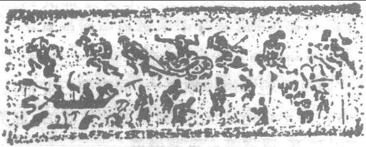 東漢畫像石。公元1972年四川郫縣出土。上部刻曼衍角抵之戲,七人赤足戴面具,面具或似猴,或似豬。中間一人頭束三髻,坐於面向左方之蛇虎身上,似在表演“東海黄公”製蛇禦虎之角戲。下部爲水嬉場面,左刻一船,船上坐三人,立一仙鶴,船周有鯉、鰱、蛇、蟾、鳥、蓮等,其後亦有若干人物嬉戲。右下角有一人及各種家畜,均在觀看表演與戲耍場面。圖案結構緊凑,人物形象生動,刻工精細,爲漢畫像石中之傑作。
