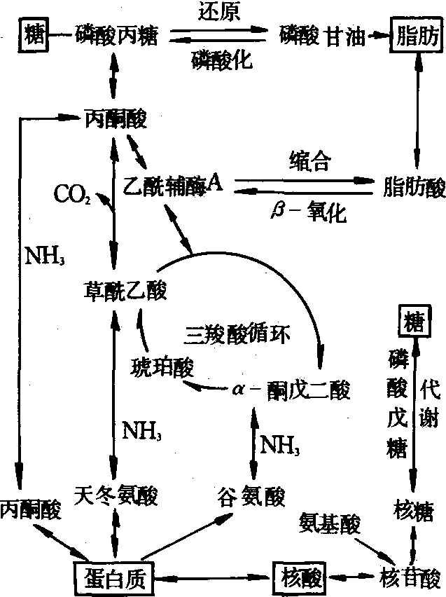 主要有机物间的代谢关系 有机物代谢是生物体内所发生的极其复杂的物质转化、能量转化和信息传递的过程,物质流、能量流、信息流成为推动生命活动进行并使生命得以延续的根本动力。 |