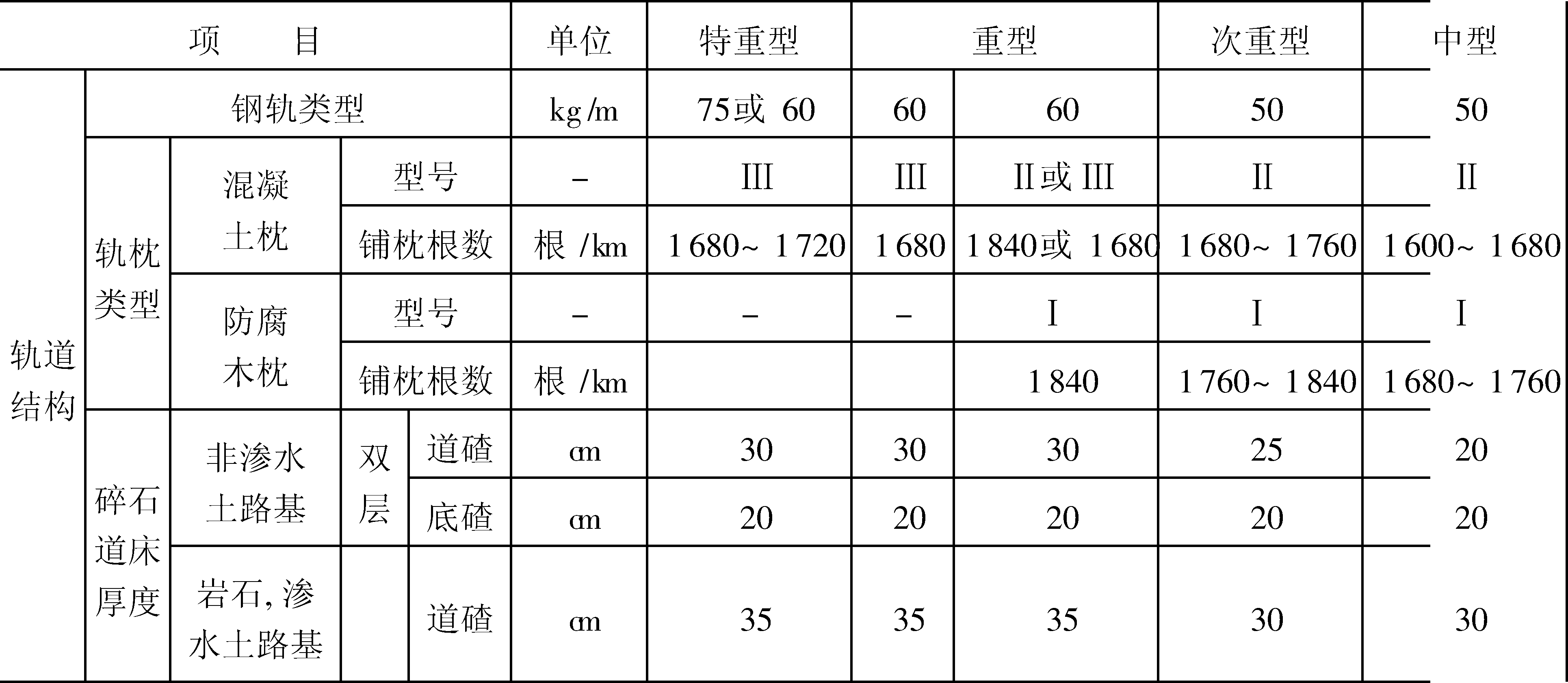 ❸养护维修的经常性和周期性。有碴轨道的优点是结构简单,铺设方便,造价低和弹性好;缺点是由于道床的存在,易变形而产生不均匀下沉,轨道平顺性差,需经常养护维修,维护费用比较高。下表列出了正线轨道的类型。正线轨道类型
