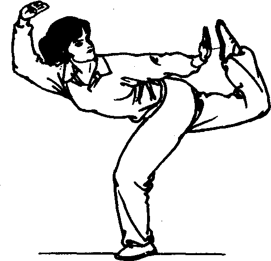 武术持久性平衡动作之一。为一腿支撑伸直或稍屈,另一腿在身后屈膝后上举,脚底朝上。上体前倾并向支撑腿一侧转体。两臂分开,手成立掌,眼看后方。动作要领:上体侧倾,躯干、大腿成反背弓,屈收小腿,支撑腿站稳,教学重点:提高后举腿的能力。反复做原地一腿支撑,另一腿后举的练习。也可手扶器械做后举腿练。