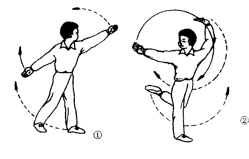 第二套少年拳动作之二。为拧身平衡动作。教学重点 强调:❶撤右腿时双手即开始由下向上甩摆。❷后提左腿、抖腕、甩头要同时完成,上体微前倾。