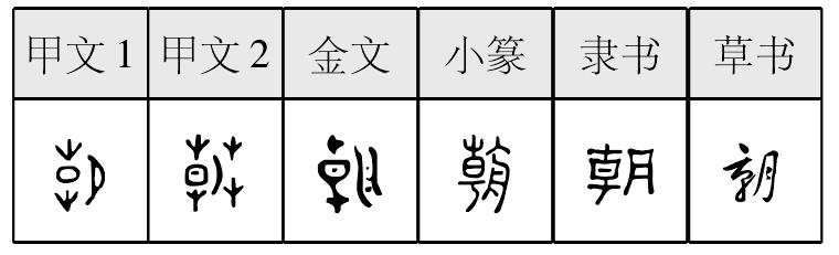 ❹ 月夕花朝 另见cháo。 朝朝,甲骨文作  ,金文作   ,小篆作 。 从日从月从茻,羅振玉説,甲骨文構形表示日出草叢而月猶未没,是朝夕之 “朝” 的初文。所附金文四形,左側沿襲甲骨文,右側从水形或从川形,後因訛變而聲化作 “舟”,最後與 “月” 同形。或説此即潮汐之 “潮”,而與 “朝”通用。卜辭或讀 “朝”,早晨。或用作地名。銘文或指早晨,或通 “廟”。戰國文獻或讀爲朝廷之“朝”,因爲朝廷是君王早晨接受群臣朝見、理董政務之處。 楚簡帛文作 ,沿襲古體。秦簡牘文作 ,古隸典型。 朝cháo,zhāo (甲) (金) (篆) 会意字,甲骨文一款为符号的组合:上下为箭头,中间为“口”;右边是弧。表朝向。一款由木、日、木、月合成。金文左边上、下为“屮”(草),中间是太阳;右边是有水的河流。意为太阳从地面升起的时候,河水上涨,称为“潮”。小篆右边为舟。隶书变“舟”为“月”。旭日东升,明月在天,也是某些早晨的自然现象。作声符生成的字有: cháo 潮(潮流) 嘲(嘲笑) zhāo 嘲(嘲哳)
