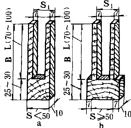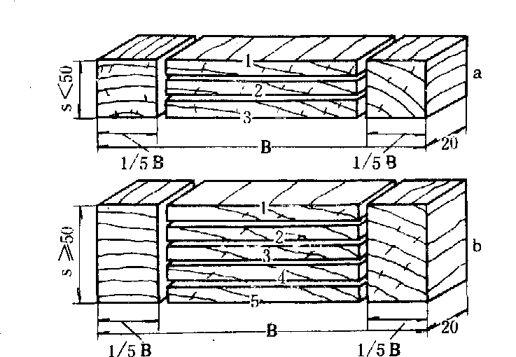干燥均匀度 用标准差σ或绝对偏差Δ表示。 ![]() 绝对偏差Δ应不超过表1中第二栏规定范围。 沿厚度的含水率偏差 将分层含水率试片按图3所示劈成3片(厚度s<50毫米)或5片(s≥50毫米),依次编好号码,然后按上述烘干法测定各小片含水率,便得知沿厚度的含水率分布。各检验板沿厚度的含水率分布的绝对偏差均不应超出表1中第四至第七栏的规定。 图3 分层含水率小试片的制取 图4 梳齿状应力试件的制取 干燥应力 直接测定干燥应力比较复杂,对于质量检验,只分析梳齿形试片的梳齿变形率。即如图4所示将应力试片锯成梳齿状。a图用于S< 50毫米,b图用于S≥50毫米。若锯材宽度B≥200毫米时,应力试片可按锯材宽度的一半(B/2)锯解,如图5,梳齿齿根取在板材宽度的边部,齿尖取在中部。 梳齿试片锯取后,在室温下气干24小时以上,或在70~100℃的烘箱中烘2~3小时,至含水率均匀后测量梳齿变形量S—S1,则应力指标为: 干燥应力指标Y的绝对值应符合表1中第八栏的规定。 可见干燥缺陷窑干前装堆时应检查木料有无开裂(表裂和劈裂)及弯曲(顺弯、横弯和翘弯)并作出标记。窑干后检查原有缺陷有无发展或新产生的干燥缺陷,包括开裂、弯曲、皱缩、炭化和变色等。各种可见缺陷指标应符合表2规定,其中劈裂和弯曲以占木料长度的百分率表示。 图5 宽板制取试验片 表2 可见干燥缺陷质量指标