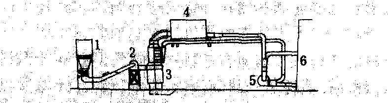 旋风燃烧法干燥木材的设备简图 1. 振动料斗; 2. 进料装置; 3. 旋风炉; 4. 除尘调 湿箱; 5. 引风机; 6. 干燥窑 |