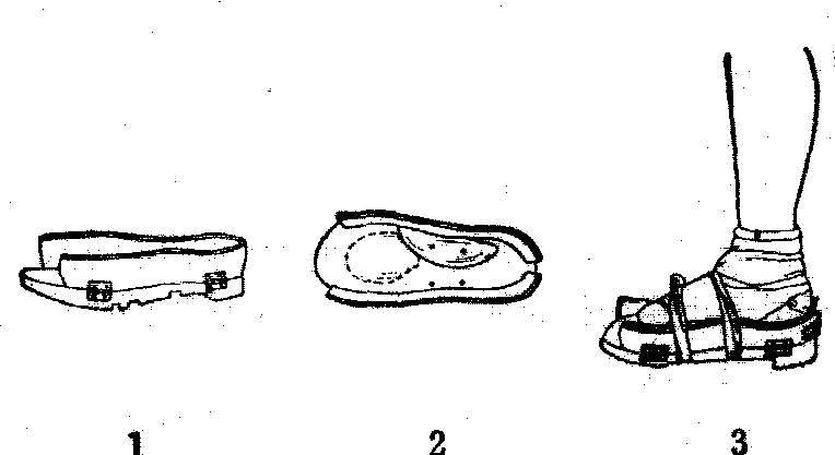 木板鞋是一种正骨器具。制法是取1.5厘米厚的木板作成鞋底,在底面中部及前部各凿1厘米宽、0.5厘米深的槽,以备布带缚紧避免滑脱。在此木板之上面中部二侧各钻二个孔留作安放足弓垫用。另用一木块制成楔形斜坡状足弓垫,内侧中点高1.5厘米。在其底部留二个木插销使木板鞋可适应左、右足。另取二块有弧度的木板用合页连于本板鞋底之两侧做为鞋帮。在两侧木板鞋帮的前部各钻三个孔,后部钻一个孔以备缚扎时使用,在整个木板鞋与皮肤的接触面均贴附毡垫(见图)。木板鞋适用于固定跗舟骨骨折、跖骨骨折等。