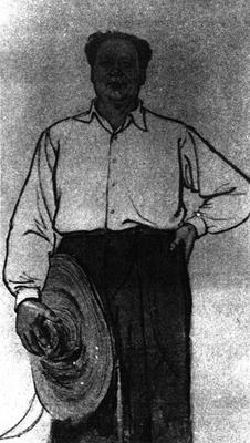【作品赏析】: 《主席走遍全国》原是五十年代的一首民歌,是歌颂毛泽东同志深入全国各地调查研究、联系群众的作风的。 画家李琦没有描绘毛主席和群众谈话等一般场面,只是用肖像的方式,画他手执草帽、放眼前视的一瞬间姿态。头发有点松散,草帽也已有些旧了,可以显现出领袖的风尘仆仆,让观者联想到民歌所描述的内容。因为取景为正面,故形象庄严;因视平线放得很低,故有须仰视才见的崇高感。不过,又由于毛主席一手插腰、一手按草帽,又身穿衬衣,因此仍能保持平易而潇洒的神态。此画作于一九六〇年,在六十年代初期曾产生一定影响,比当时那些一味把领袖神化的矫饰作品高出一筹。画风质朴,形象逼真,是一件成功的领袖肖像。 。【作者介绍】: 李琦(1928-),山西平遥人。中央美术学院国画系教师,擅中国画人物。  现代 李琦 轴 墨笔设色 纵197厘米横117.5厘米 |