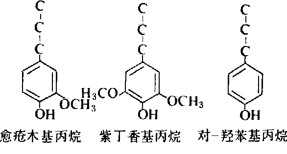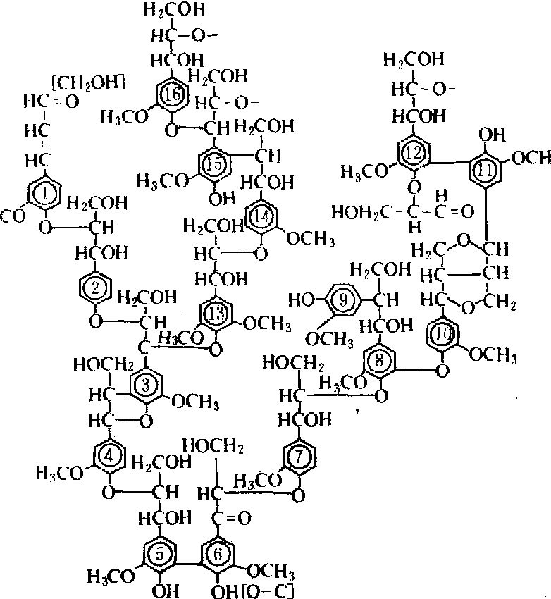 释义 | 木质素lignin由松柏醇、芥子醇和对-香豆醇经酶作用脱氢聚合而成的无定形天然高聚物。又称木素。木质素最早由舒尔兹(F.Schulze)于1857年提出,来源于拉丁语“lignum”。它是植物界中仅次于纤维素的一类最丰富和最重要的有机高聚物。广泛分布于具维管束的羊齿类植物以上的高等植物中。木质素与半纤维素一起作为细胞间质填充于胞间层以及细胞壁的微细纤维间。它能减少细胞壁的透水性,增加树木茎干的抗张强度,也能防止细胞受微生物侵蚀。木材的木质素含量为20~40%,禾本科植物为15~25%。 木质素在植物中的分布不均一。随树种、树龄、取样部位的不同,木质素的含量和结构都有差别。据紫外显微镜和扫描电镜—能量分析仪(SEM-EDXA)测定,针、阔叶树材和禾本科各类细胞的胞间层与细胞角的木质素浓度都比次生壁高得多,其中以细胞角的浓度最高。由于次生壁的体积比胞间层和细胞角大得多,木材和禾本科木质素约有2/3分布于次生壁。阔叶树材不同类型的细胞中木质素的类型不同。木纤维中的木质素主要由紫丁香基丙烷构成,而导管单元的木质素主要由愈疮木基丙烷构成。 分离方法 按照木质素分离的原理可分为两类:❶溶解植物中的高聚糖,保留木质素残渣; ❷溶解木质素留下高聚糖。属十前法分离的木质素有硫酸木质素、盐酸木质素和高碘酸盐木质素等;属于后者的有磨木木质素(简称MWL)、纤维素酶解木质素(简称CEL)、二氧六圜木质素等,与制浆造纸工业有关的木质素磺酸、碱木质素和硫酸盐木质素也属于此类。基于天然存在于植物中木质素的活泼性、结构的复杂性以及与高聚糖间错综复杂的关系,至今未能分离出完全代表植物中木质素的分离木质素。用缓和方法分离的木质素如MWL和CEL常用于木质素结构的研究。 化学结构 包括元素组成、官能团、基本结构单元和结构单元间的连接、木质素的结构模型。 元素组成 木质素主要由碳、氢、氧三种元素组成。禾本科木质素除含上述元素外,还有少量氮元素。 官能团 木质素的主要官能团有甲氧基、羟基和羰基。甲氧基是木质素的特征官能团。存在于苯丙烷结构单元的苯环上。针、阔叶树材木质素中的甲氧基分别为14~16%和17~22%。木质素中的羟基有存在于苯环上的酚羟基和侧链上的醇羟基。羰基存在于结构单元的侧链上。禾本科木质素结构单元侧链上还有羧基。 基本结构单元和结构单元间的连接 木质素的基本结构单元为苯基丙烷,即 醚键 木质素中醚键包括酚醚键、烷醚键和二芳醚键。以酚醚键为主。酚醚键中芳基-甘油-β-芳醚即β-O-4醚键数量最多,占木质素结构单元的一半左右(结构图中结构单元1-2, 2-3, 4-5, 6-7, 7-8和13-14)。其余为α-O-4醚键(结构单元3-4, 3-13和15-16)和二芳基醚键(结构单元8-10)。此外还有二烷基醚键(结构单元10-11)等。 碳碳键 主要的碳碳键有β-5(结构单元3-4),β-β(结构单元10-11), 5-5(结构单元5-6)和β-1(结构单元8-9)等。 禾本科木质素中还有对-香豆酸和阿魏酸与相邻结构单元侧链α或γ碳键的酯键。 木质素的结构模型 针叶树材木质素结构模型有弗罗登伯尔(K. Freudenberg)1968年提出的由18个苯丙烷构成的云杉木质素模型,阿德勒(E. Alder)1977年提出的16个苯丙烷构成的云杉木质素模型(见图),神原彰1980年提出的28个苯丙烷组成的结构模型。最大的针叶树材木质素结构模型是格莱塞(W.Glasser)1981年提出由94个苯丙烷组成的火炬松木质素模型。尼姆兹(H.Nimz)1974年提出阔叶树材山毛榉木质素模型图,包括25个苯丙烷单元。上述各种模型都只能代表木质素结构的片断。目前已能较详细地描述针叶树材的木质素结构。阔叶树材及禾本科木质素的结构尚有许多不明了处。鉴于木质素细结构的复杂性和现行分析方法的某些缺陷,现有的木质素模型仍需修改。 物理性质 随木质素的来源、分离和纯化方法而异。分离木质素的颜色由浅乳酪色至深棕色。无光学活性。折射率1.61。密度1.25~1.40克/平方厘米。分子量为几百至几十万,具多分散性。木材磨木木质素分子量为10 000~20 000, 禾本科磨木木质素为7 000~9 000。分子形状近于球状或块状。不溶于常用的中性有机试剂。木质素具热塑性,其软化温度与木 云杉木质素结构片断图 质素的分子量和含水率有关。干的分离木质素软化温度 一般为120~200℃。木质素的热塑性与制浆造纸和木材加工工业有密切关系。化学性质 木质素可发生侧链反应和芳核的选择性反应。侧链反应多与活性苯甲醇、烷醚键和芳醚键有关。芳核上主要发生卤化和硝化反应。与木质素改性有关的反应有甲酰化、氰乙基化、酚化和接枝共聚等。木质素的化学反应对制浆造纸尤为重要。木质素在制浆中发生侧链与氢氧化钠、硫化钠和亚硫酸盐的亲核反应,在漂白中与分子氯、二氧化氯、氧、次氯酸盐和过氧化氢发生各种亲电和亲核反应。在高温的酸性和碱性介质中还发生缩聚反应。 木质素能与脂肪族化合物、酚类、芳香胺类、杂环化合物和无机化合物发生显色反应。木质素的显色反应对于木质素的鉴别、分类和分布的研究以及特定结构基团的定量都有密切的关系。其中缪勒(Maule)反应和克劳斯—贝文(Cross-Bevan)反应常用来鉴别针、阔叶树材。 利用 木质素除可作为燃料或保留于纸浆中生产高木质素含量的纸浆外,可以其聚合物形式用作染料;油井、碳黑、水泥、混凝土等