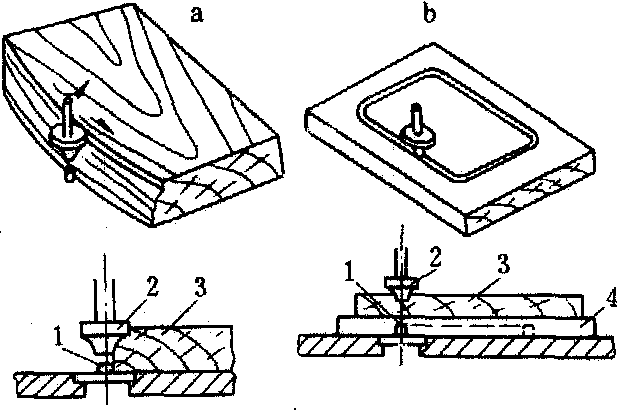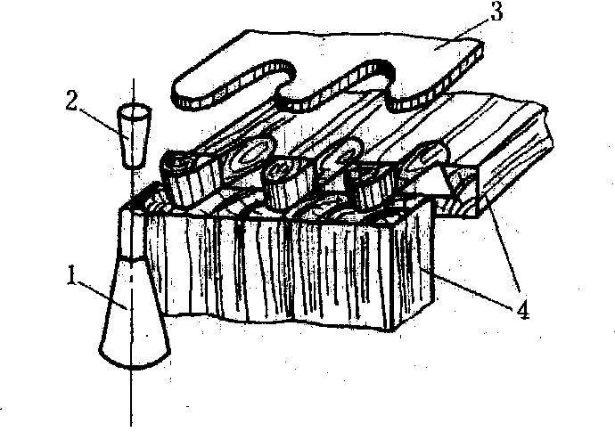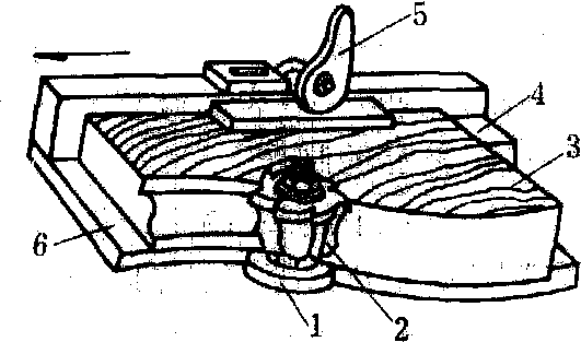图1 燕尾榫机加工半隐燕尾榫 槽榫 利用回转工具,沿纤维方向加工榫头与榫槽的过程。榫与槽的加工在刨床、铣床或万能圆锯机上均可完成。在平刨、压刨上利用导尺和相应的工具,可加工宽度较大的榫与槽(图2中1、2、3、4)。在四面刨上利用垂直的刀头可加工宽度较小的榫与槽(图2中5、6)。切削横向的槽口,可用悬臂式万能圆锯机,采用铣刀头或多锯片叠在一起中间夹有钩形铣刀进行加工。对燕尾形槽口,则必须采用不同直径的圆锯片叠在一起或采用锥形组合刀具,加工时须将刀轴倾斜一定角度,也可在立式上轴铣床上用燕尾形端铣刀进行加工。合页槽可在专用的起槽机上完成。 ![]() 图2 刨床加工槽榫示意 打眼 用打眼机或钻床,加工榫眼的工艺过程。榫眼有长方形、长圆形与圆形等几种。长方形榫眼,常采用带有空心钻套的打眼机,加工精度较高。链式打眼机可 一次打出长方形榫眼,但榫眼内壁较粗糙,不贯通的榫眼底部呈弧形,需进行补充加工。该法生产率高,常用于建筑木构件打眼。长圆形榫眼,用钻床或上轴铣床加工。圆形眼(孔)可选用标准钻头,采用立式单轴或多轴钻床加工。在零件的端部打孔,多采用卧式钻床完成;对直径较大的圆孔应在钻轴的刀梁上装有两把切刀或圆筒形锯片进行加工;在薄胶合板或纤维板上打孔,可采用冲压法加工。螺钉孔需用带有阶梯状的小钻头来完成。 铣型面 利用成型刀具或平面刀具并借助夹具来加工各种型面和曲面的工艺过程。由于型面不同,加工方法也不同。❶加工直线型面,需使用相应的成型铣刀,零件沿机床导轨通过刀具而铣削。当零件宽度较大时,可在压刨、四面刨的水平刀头上安装相应的成型铣刀来加工,但用压刨加工时,需在台面上增加导向装置。 ❷加工曲线型面如椅后腿、沙发扶手的型面,必须使用夹具(样模),夹具的边缘做成零件所要求的形状,当夹具边缘沿挡环移动时,刀具就能在工件表面加工出所要求的曲线型面(图3)。若用回转工作台进给的铣床来加工,是在工作台上同时固定数只夹具,随着工作台的回转即按夹具形状对零件进行铣削。零件表面上的平雕与透雕,应采用上轴铣床加工,在工作台上装有仿型定位销,定位销与刀轴的回转中心同在一垂直线上,夹具内边缘靠紧仿型定位销移动,刀具就能在工件表面上镂铣出所需要的纹样或图案(图4)。圆柱