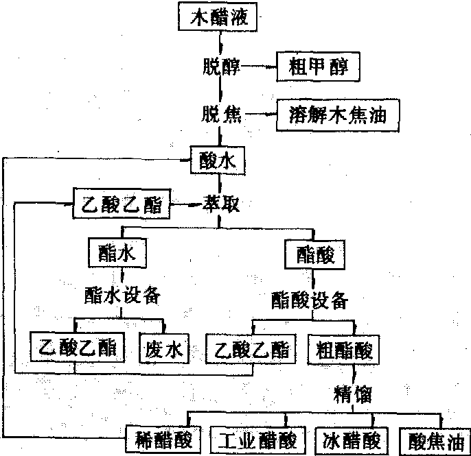 萃取法制取醋酸的工艺流程示意图 往酯酸设备。酯水从底部引出, 其中含乙酸乙酯8.4%,送往酯水设备回收乙酸乙酯。酯酸送入酯酸设备的精馏塔下部,从塔顶蒸出乙酸乙酯再用于萃取。酸液从精馏塔流入提馏塔蒸出残存的乙酸乙酯后,从塔底放出粗醋酸。以上加工制得的粗醋酸中含有蚁酸、丙酸、丁酸、戊酸、醛类、酮类、醚类、醇类和焦油杂质等,需要进一步精制。精制的方法一般用精馏法分离低沸点的醛类和醇类等以及高沸点的焦油杂质,制取冰醋酸、工业醋酸和食用醋酸等成品。 醋酸为无色透明液体,有刺激性气味,在16.3~16.7℃时结晶。用来制造醋酸酯、醋酸盐、醋酸纤维、醋酐、食用醋和药品等,也用于纺织、化工等工业部门。 甲醇 脱醇过程中得到的粗甲醇含醇类、酯类、酮类、醛类、酸类、甲胺、吡啶和呋喃类化合物。这些物质常能形成恒沸混合物,除甲醇外,难于用普通精馏的方法把它们分离。加工的方法是先将粗甲醇用水稀释到浓度为20~30%,澄清后,约占原体积15~20%的木醇油浮出水面,分离后,可加工制取溶剂、恒沸点剂、浮选起泡剂或木焦油呋喃。稀释时如加入氢氧化钠溶液以中和其中的酸类,可防止设备的腐蚀。 稀释过的粗甲醇水溶液,在间歇式设备中精馏时可以得到丙酮酯溶剂(46~60℃)、浓甲醇(64~69℃)、丙烯油(90~95℃)、糠醛油(95~100℃)和其他半成品馏分。浓甲醇中仍含杂质,通过再稀释和精馏可制得甲醇成品。甲醇为无色、透明的可燃性液体,带葡萄酒气味,有毒。用于制造福尔马林、乙酸甲酯、缩醛、胺仿等。 木醋液pyroligneous acid木材干馏得到的液体产物在澄清分离出沉淀木焦油后的红褐色液体。木醋液有特殊的烟焦气味,密度1.020~1.050,含10%~20%的各种有机化合物如酸类、醇类、酮类、酯类、酚类、醛类等。可直接用作土壤杀菌剂,能有效地防治针叶树幼苗立枯病,或作防臭剂和食品香料。木醋液进一步精馏可得粗甲醇和脱醇木醋液。前者可加工制取甲醇和溶剂等产品;后者可加工制取醋石、醋酸钠、工业醋酸、食用醋酸和冰醋酸等,用于纺织、皮革、食品等工业部门。 木醋液木材干馏得到的液体产物在澄清分离出沉淀木焦油后剩下的红褐色液体。有刺激性气味。主要含水、醋酸、甲醇等。可加工制得醋酸、甲醇等产品。 |