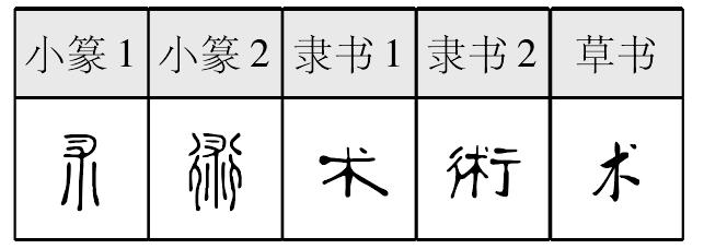 象形,小篆1象一种植物形,隶定为“朮”或“术”。读zhú,菊科术类植物的泛称,有白术、苍术等。術,形声,从行,朮(术)声,行指道路,本义读shù,街道,城中的道路,引申为途径、办法、策略、技艺、学说、主张等。《简化字表》把“術”简作“术”,省略意符。 【辨析】 ❶“术”与“術”不是等义简繁字。 ❷以“术”作音符构成的形声字一般韵母为u,但声调和声母不同。shù:述、沭∣shú:秫∣chù:怵。 ❸術(术)/述/遂/隧 这四个字都有道路义,读音相同或相近,是同源字。 【构词】 白术(白朮)∣苍术(蒼朮)∣金兀术(金兀朮,人名)∣术士(術士)∣术语(術語)∣技术(技術)∣美术(美術)∣权术(權術)∣手术(手術)∣武术(武术)∣学术(學術)∣战术(戰術)术 (shù)“秫”之古文。上象大穗, 象其皮。皮離於莖者,著其用也,可爲席。 【按】术,一音zhú,白术、倉术,皆爲草本藥材。與表示城邑中道路之義的“術”不同。 |
