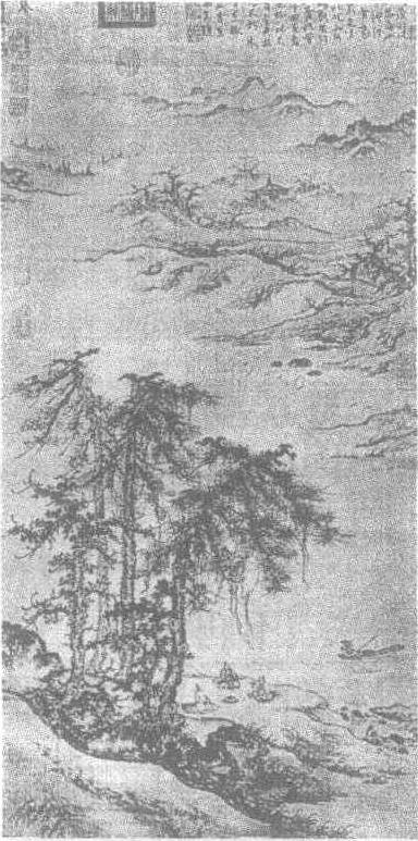 绢本,水墨画。纵120厘米,横58厘米。现藏台北故宫博物院。近景几株参天古松下面,团坐三位高人逸士,一人抚琴,二人静听。正在江中垂钓的一位老渔夫也闻琴音而来。江面辽阔,一行芦雁自由自在地飞翔。对面峰峦迭翠,时有亭台楼阁掩映其间。从画面形象看,是继承李成、郭熙传统而加以发展,用笔比较粗放,线条富有流动感。