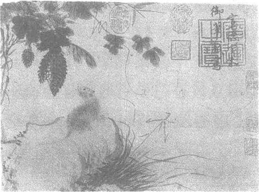 释义 | 朱瞻基苦瓜鼠图卷 朱瞻基苦瓜鼠图卷明。朱瞻基绘。纸本设色。纵28.4厘米,横38.5厘米。北京故宫博物院藏。朱瞻基(公元1399—1435年),明太祖朱元璋的曾孙,仁宗长子。庙号宣宗,建元宣德,在位十年,自号长春真人。善书,尤工绘事,山水、人物、走兽、花鸟、草书无不精妙。是一位颇有才艺的帝王,可与北宋徽宗,南宋赵构相提并论。在他的倡导下,宫廷绘画进入了一个全盛时期,宫廷画家人才济济,高手云集。画家每呈作品,他都一一观览,加以论评。也常以书画赐赠臣下。此图绘一园中小鼠踞止于岩石之上,回首仰望一只垂挂的苦瓜,瓜皮开绽,瓜瓤显露,瓜藤攀绕于竹枝之间,藤梢飘向空中,舒展自如。宽展的瓜叶交迭掩映,疏密相间。石缝中野草丛生,柔韧纤长。小鼠描绘得生动逼真,自然传神。耳、爪、鼻、须皆以细笔勾描,鼠目以焦墨点出,显得十分精明灵巧。全身的茸毛则以干笔涂擦点染,很有质感。山石、瓜藤、草叶用水墨写意法,挥洒纵放如草书。墨色浓淡相间,干湿结合,有较多的元人笔意及文人画风。图中自题:“宣德丁未,御笔戏写。”钤〈广运之宝〉朱文方印。此图作于宣德二年(公元1427年),朱瞻基时年29岁。 ☚ 倪端聘庞图轴 商喜关羽擒将图轴 ☛ |