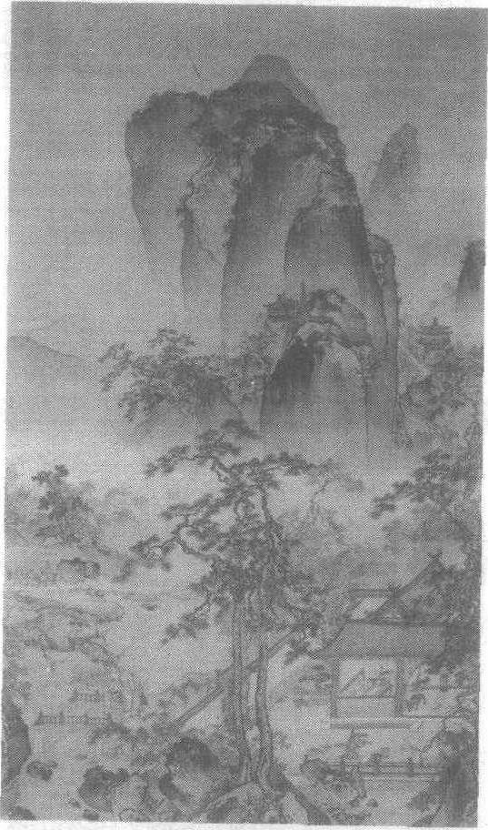 明。朱端绘。绢本设色。纵230.2厘米,横124.3厘米。天津市艺术博物馆藏。朱端(生卒年不详),字克正,号一樵,海盐(今属浙江)人。少时贫,以渔樵为生。孝宗弘治十四年(公元1501年)进士,刻有〈辛酉征士〉印。武宗正德(1506—1521年)间以绘画供事仁智殿,授锦衣卫指挥,钦赐〈一樵〉图章,即以“一樵”为号。他工人物、山水、花木、翎毛,山水宗马远,人物师盛懋,花鸟效吕纪,墨竹学夏,是浙派名家之一,亦善书。此图近景绘一山中庭院,洁净优美,有宽敞明亮的房舍,舍前点缀着大大小小的盆景,院四周挺劲的苍松长于堆石间。舍中有一老翁挥毫展卷坐于桌前,忽然回首后望似在企盼着什么。透过庭院敞开的大门,见一执杖的老者携一童稚正拾级而上,走向松院。图中远景山峦耸立,山谷中云烟氤氲,一座高塔、棵棵劲松和点点房舍依稀朦胧而现。此图运笔遒劲,奔放中见工整,构图谨严,层次分明,错落有致,景物的质感较强,颇有气势。款署“朱端”。