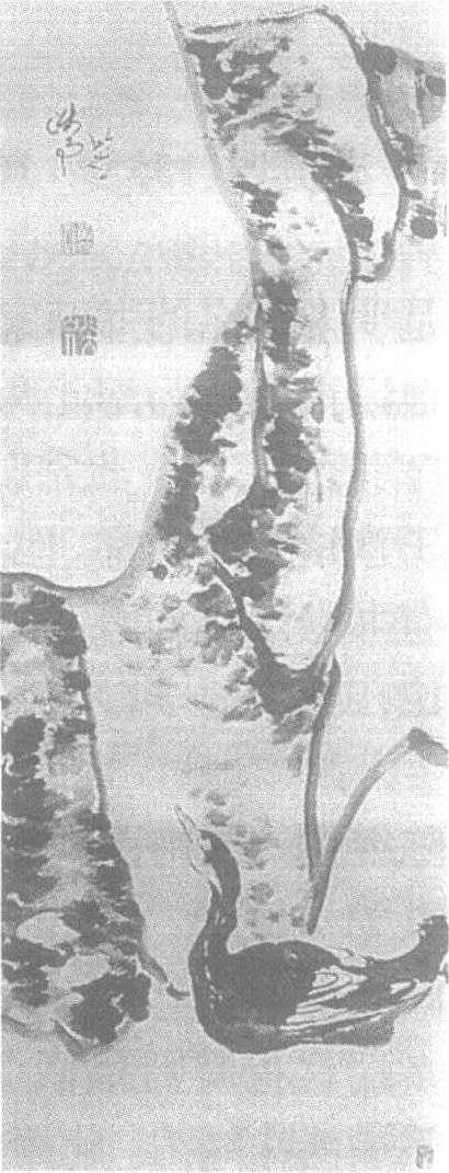 纸本,墨笔。纵100.6厘米,横38.8厘米。现藏上海博物馆。此画描写绝壁下水中一鸭游动中昂首向上凝视。笔墨淋漓苍劲。画面情节十分单纯,抽象的石头之外,只有 一只鸭子,昂首向上的动作也不知何谓,是发现了甚么,它的后面是否还有同类,都不得而知,留给读者去想象。画面左上部空白,题写“八大山人涉事”。押两方白文印,使墨色画面增添了活泼感,同时使画面的虚实疏密有了对比呼应。