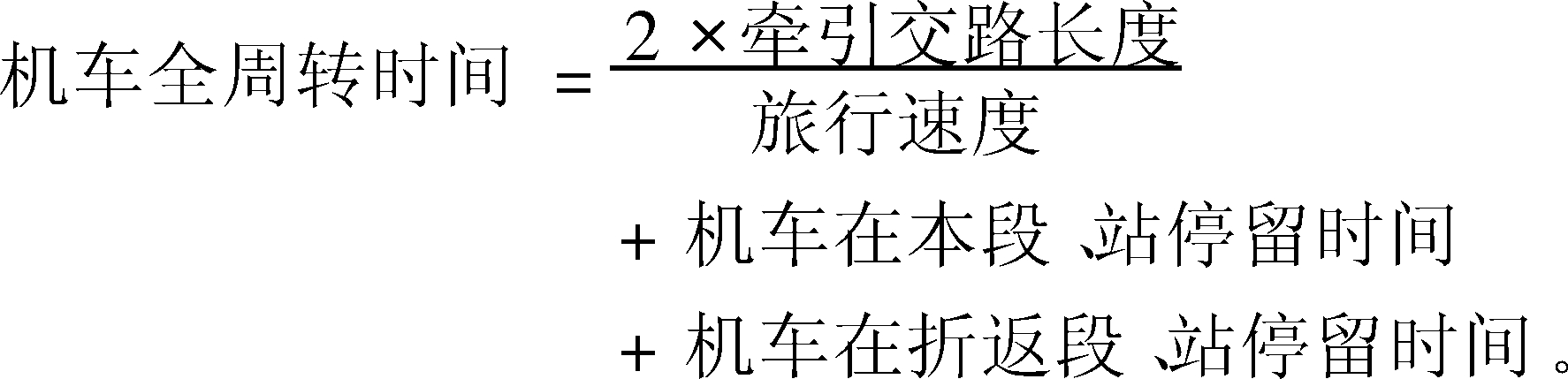 机车在交路上往返牵引一对列车所消耗的全部时间。包括机车在牵引交路上往返运行时间,在机务本段及所在站停留时间以及在折返段及所在站停留时间。其计算公式为: