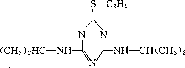 三氮苯类内吸、选择性除草剂。化学名称:2-乙硫基-4,6-双(异丙胺基)-均三氮苯。化学结构式如下。纯品为白色固体,熔点104~106℃,几乎不溶于水,易溶于有机溶剂,在土壤中淋溶性差。可通过根部内吸,抑制植物的光合作用。适用于棉田、西瓜田使用,防除一年生禾本科杂草与阔叶杂草,如稗草、碱草、马唐、千金子、苋、藜、蓼、牵牛花、龙葵等。对人、畜低毒,大鼠急性口服LD50>5 000 mg/kg。