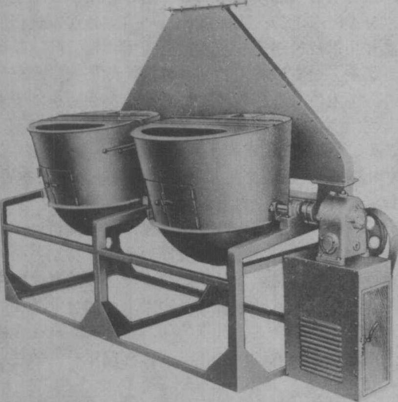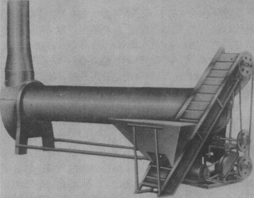 图1 184型双锅杀青机 中国生产的锅式杀青机主要有84和80型两大类。84型杀青锅口径为84厘米, 锅深34厘米或31厘米; 80型杀青锅口径为80厘米, 锅深28厘米。个别地区也有用81型或其它型号锅的。每锅投叶量8~10千克左右,主轴转速一般在20~30转/分,应视鲜叶的老嫩程度和含水量多少灵活掌握。锅式杀青机广泛应用于中国各绿茶产区的小型初制茶厂, 大型茶厂也有应用。 槽式杀青机 主要由槽锅、炒叶腔、炒叶器、上叶装置、炉灶和传动装置等部分组成, 槽锅为半圆柱形, 由几片半圆形的铸铁锅片连接而成, 炒叶腔用铁皮片或砖砌制, 一侧有出茶门, 前端顶部有盖, 炒叶器为长条形炒手, 安装在槽锅中心主轴上。炒叶器的数量及其安装角度视槽锅的长短而不同, 它对鲜叶的翻炒质量和前进速度的影响极大。上叶用皮带输送装置。炉灶用砖砌, 以煤或柴做燃料。它的工作原理是燃料燃烧后以热传导和辐射的方式加热槽锅, 鲜叶在槽锅内, 经炒叶器的不断翻炒, 均匀而充分地同槽锅壁接触, 达到杀青的目的。在炒手斜度的作用下, 不断将鲜叶推向出茶口, 实现了连续作业。本机具有锅式杀青机的一些特点:由于工作时鲜叶紧贴槽锅壁,并受炒叶器的不断翻炒作用, 制作茶叶条索较好, 再加上炒手轻度揉捻, 使鲜叶细胞初步揉破, 可增加茶汤的浓醇度。同时它的生产率高, 耗燃料少, 可以连续化生产。但槽锅寿命短, 特别是前端高温区的锅片极易烧穿, 需要经常更换。另外, 锅片的连接处密封不好, 易漏烟或产生焦叶, 碎茶较多, 降低制茶品质。 中国生产的槽式杀青机型号及批量均较少。按槽锅直径分有60厘米、70厘米等几种,槽锅长度4米,炒叶器工作转速在26~29转/分之间,一般视鲜叶的老嫩程度和含水量多少适当调整。槽式杀青机仅在部分小型茶厂中使用。 转筒杀青机 主要由筒体、上叶传送带、机架、炉灶和传动装置等部分组成(图2)。转筒为主要工作部件,用薄钢板卷成圆柱形,筒内壁沿轴向焊有三段4~6片螺旋形导叶片,分别称为进叶段、工作段和出叶段。三段导叶片的螺旋角各不相同, 一般进叶段最大, 为60°左右, 工作段为7°~15°, 出叶段为45°。机架为金属框架, 炉灶用砖砌,燃料用煤或柴,个别用柴油。可以自动控制杀青温度, 有利于保证制茶质量。本机工作原理是: 燃料燃烧后直接加热转筒, 鲜叶在筒内被不断抛翻, 与筒壁均匀接触, 另一方面, 在鲜叶自身重力和螺旋形导叶片的作用下, 不断被抛向前进, 达到连续化生产的目的。转筒式杀青机结构简单, 操作方便, 燃料消耗少能连续作业, 生产率较高, 工人的劳动强度低。但由于没有炒手的揉搓作用, 制出茶叶浓醇度稍差。