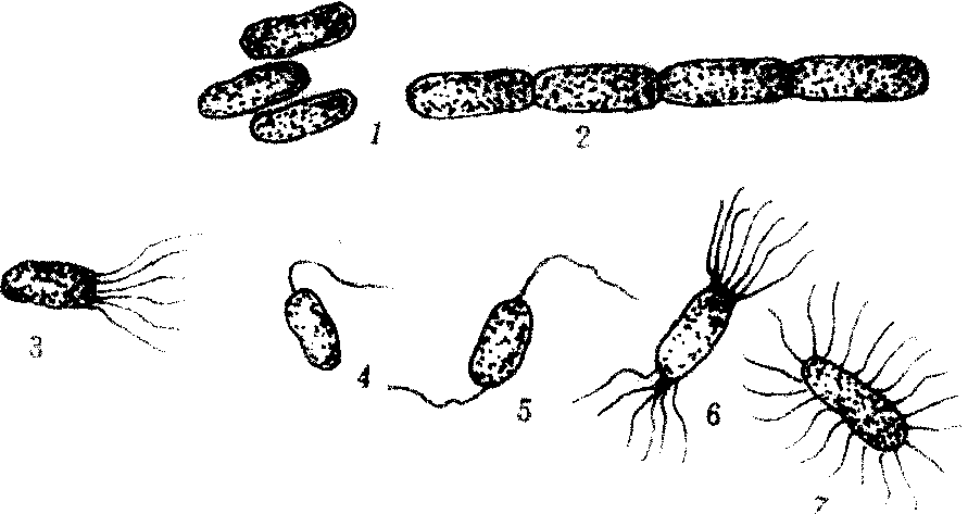 图64 各种 1.单杆菌 2. 链杆菌 3~7.具鞭毛的各种杆菌