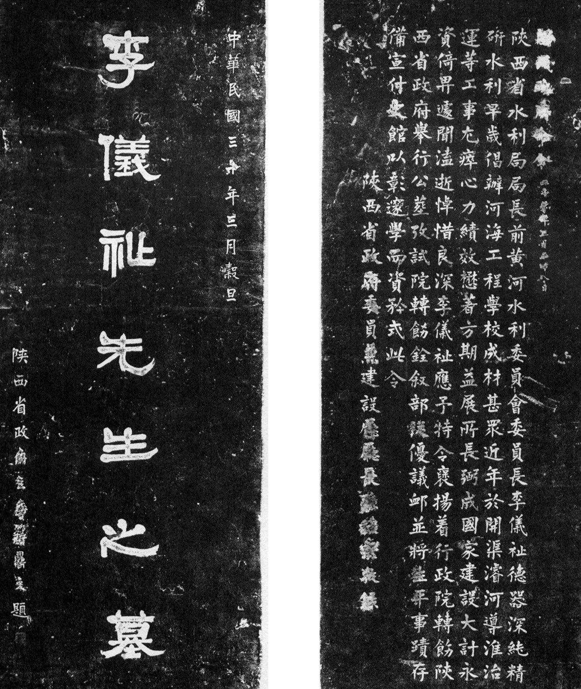 中华民国二十七年(1938)刻。碑立于泾阳县王桥镇寺背后村李仪祉墓前。碑首为二龙戏珠,有圭额,上书“永垂不朽”,高0.94米。身高2.95米,隶书“李仪祉先生之墓”。座高0.45米,宽1.09米,长1.72米,厚0.32米,阴刻国民政府命令,楷书。碑文:“陕西省水利局局长、前黄河水利委员长李仪祉,德器深纯,精研水利。早岁倡办河海工程学校,成材甚众。近年于开渠浚河、导淮治运等工事,尤瘁心力,绩效懋著。方期益展所长,弼成国家建设大计,永资倚畀,遽闻溘逝,悼惜良深。李仪祉应予特令褒扬,着行政院转饬陕西省政府举行公葬,考试院转饬铨叙部从优议恤,并将生平事迹存备,宣付史馆,以彰邃学,而资矜式。此令。陕西省政府委员兼建设厅长孙绍宗敬录。”