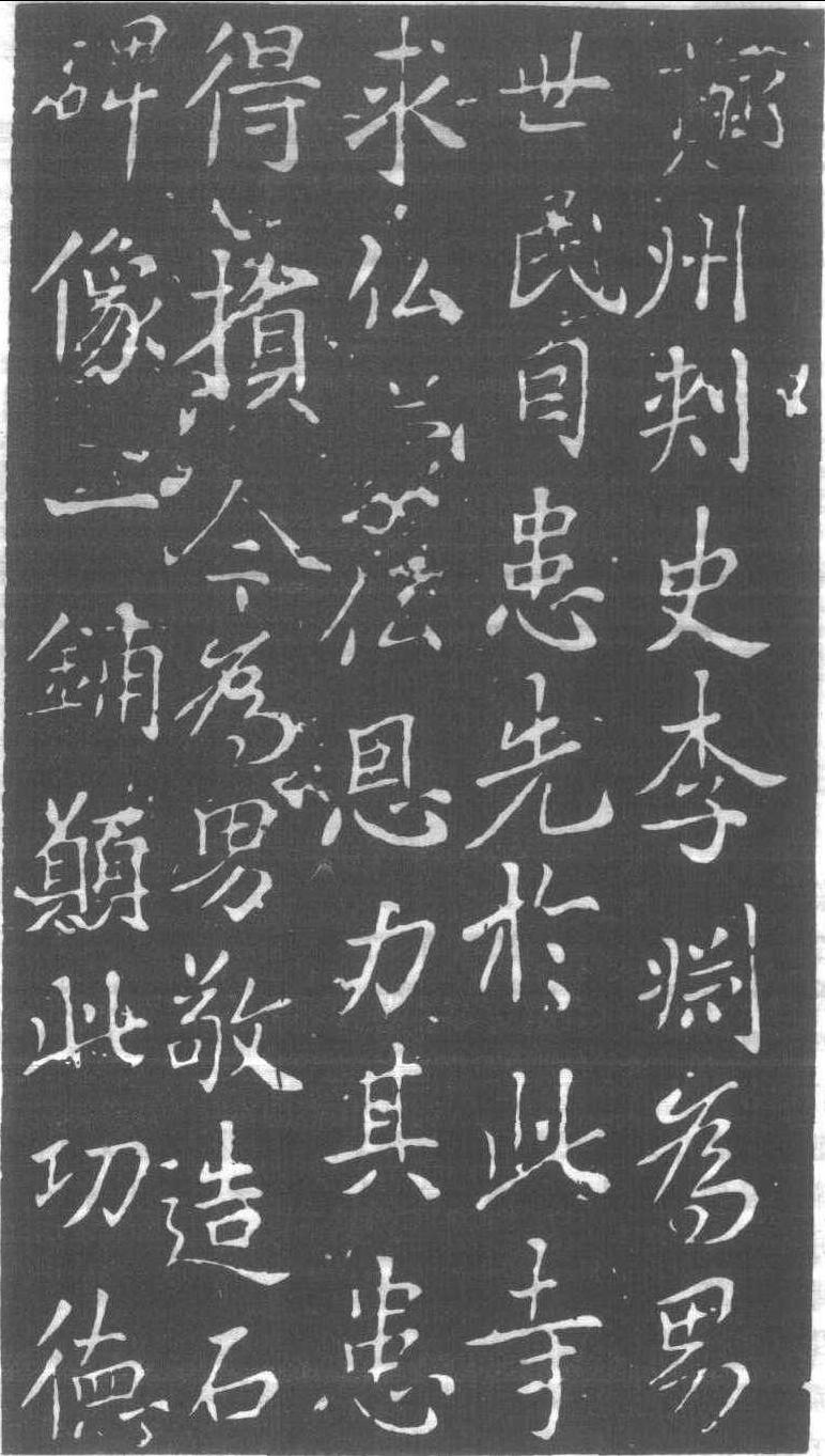 释义 | 李淵造像記一曰 〈唐高祖為子祈疾疏〉。隋·大業二年 (606) 刻。正書十行,行八至九字不等。此係隋李淵(後之唐高祖)為子世民(後之唐太宗)病愈,祈禱於草堂寺時之疏。石高一尺六寸五分,廣一尺四寸。原石早佚,現存陝西鄠縣(即户縣)草堂寺者為元代重刻。筆法類河南(褚遂良)而字迹平庸。 李淵造像記 (局部) |