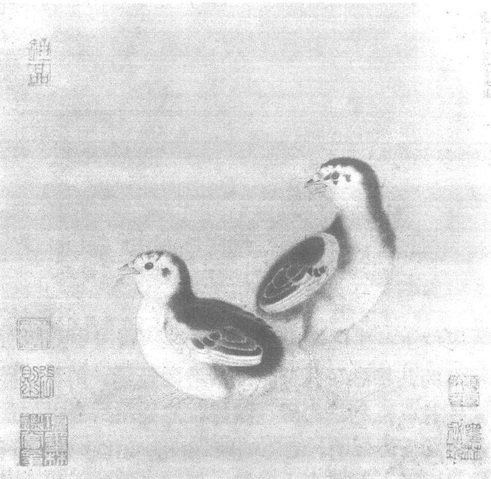 绢本,设色。纵23.8厘米,横24.7厘米。现藏北京故宫博物院。画面背景不着一笔,精心刻画了两只待饲的鸡雏,毛茸茸、肉乎乎、傻愣愣的,十分可爱。一只叫着奔向画外,可能是见到了主人,或是见到了母鸡,给观众留下想象的余地。另一只张喙待饲,是主人送来了食物,或是母鸡叼着食物正向小鸡走来,把未出现在画面上的饲者自然引入观众的思绪,同时使人联想到画外的母鸡和小鸡,弦外有音,画外有画,使有限的画面豁然开朗。言有尽而意无穷,收到以少胜多的艺术效果。画家对小鸡的外表特征和生活习性也非常熟悉,把握准确,涵之于胸中而行之于笔下; 大头、胖身、短腿、走路不稳、反应灵敏等特征,被刻画得维妙维肖,甚至连小鸡混身长着短而细的茸毛这 一外形特征,都被画家准确地描绘下来。难怪画史称赞他“写飞走花竹,颇有生意”了。这幅画的构图处理也非常巧妙,两只雏鸡被安排在画面偏右部位,一身向右,一身向左,但眼神都向左,使画面保持均衡。向左的小鸡自然地伸头叫着奔向画外,身向右的大一点的雏鸡扬头回首张喙。这两只小鸡,不仅型体大小有区别,动态也有变化,形成一侧一正、一高 一矮、一动一静、一大一小的对比呼应,同时把人的视线引向画外,给人以丰富的联想,使有限的画面蕴含了无限的内容。无背景、无陪衬,更便于调动观众的想像力。